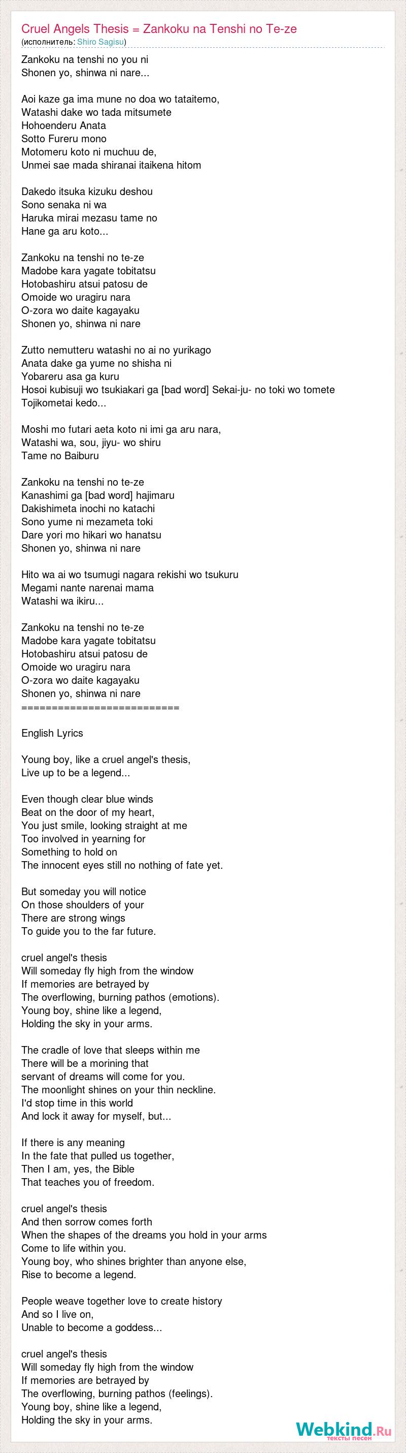 Zankoku na tenshi no you ni Shonen yo, shinwa ni nare... Aoi kaze ga ima mune no doa wo tataitemo, Watashi dake wo tada mitsumete Hohoenderu Anata Sotto Fureru mono Motomeru koto ni muchuu de, Unmei sae mada shiranai itaikena hitom Dakedo itsuka kizuku deshou Sono senaka ni wa Haruka mirai mezasu tame no Hane ga aru koto... Zankoku na tenshi no te-ze Madobe kara yagate tobitatsu Hotobashiru atsui patosu de Omoide wo uragiru nara O-zora wo daite kagayaku Shonen yo, shinwa ni nare Zutto nemutteru watashi no ai no yurikago Anata dake ga yume no shisha ni Yobareru asa ga kuru Hosoi kubisuji wo tsukiakari ga [bad word] Sekai-ju- no toki wo tomete Tojikometai kedo... Moshi mo futari aeta koto ni imi ga aru nara, Watashi wa, sou, jiyu- wo shiru Tame no Baiburu Zankoku na tenshi no te-ze Kanashimi ga [bad word] hajimaru Dakishimeta inochi no katachi Sono yume ni mezameta toki Dare yori mo hikari wo hanatsu Shonen yo, shinwa ni nare Hito wa ai wo tsumugi nagara rekishi wo tsukuru Megami nante narenai mama Watashi wa ikiru... Zankoku na tenshi no te-ze Madobe kara yagate tobitatsu Hotobashiru atsui patosu de Omoide wo uragiru nara O-zora wo daite kagayaku Shonen yo, shinwa ni nare ========================== English Lyrics Young boy, like a cruel angel's thesis, Live up to be a legend... Even though clear blue winds Beat on the door of my heart, You just smile, looking straight at me Too involved in yearning for Something to hold on The innocent eyes still no nothing of fate yet. But someday you will notice On those shoulders of your There are strong wings To guide you to the far future. cruel angel's thesis Will someday fly high from the window If memories are betrayed by The overflowing, burning pathos (emotions). Young boy, shine like a legend, Holding the sky in your arms. The cradle of love that sleeps within me There will be a morining that servant of dreams will come for you. The moonlight shines on your thin neckline. I'd stop time in this world And lock it away for myself, but... If there is any meaning In the fate that pulled us together, Then I am, yes, the Bible That teaches you of freedom. cruel angel's thesis And then sorrow comes forth When the shapes of the dreams you hold in your arms Come to life within you. Young boy, who shines brighter than anyone else, Rise to become a legend. People weave together love to create history And so I live on, Unable to become a goddess... cruel angel's thesis Will someday fly high from the window If memories are betrayed by The overflowing, burning pathos (feelings). Young boy, shine like a legend, Holding the sky in your arms.