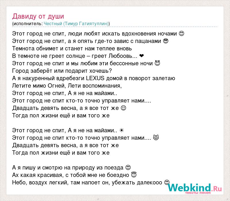 Этот город не спит, люди любят искать вдохновения ночами 😍 Этот город не спит, а я опять где-то завис с пацанами 😎 Темнота обнимет и станет нам теплее вновь 💥 В темноте не греет солнце – греет Любоовь... ❤ Этот город не спит и мы любим эти бессонные ночи 😈 Город заберёт или подарит хочешь? 🌍 А я накуренный вдребезги LEXUS домой в поворот залетаю 🚘 Летите мимо Огней, Лети воспоминания, 🔥 Этот город не спит, А я не на майами.. 👻 Этот город не спит кто-то точно управляет нами.... 🙄 Двадцать девять весна, а я все тот же 😌 Тогда пол жизни ещё и вам того же 🙏 Этот город не спит, А я не на майами.. ☀ Этот город не спит кто-то точно управляет нами.... 😾 Двадцать девять весна, а я все тот же 🤔 Тогда пол жизни ещё и вам того же 🙏 А я пишу и смотрю на природу из поезда 😍⛅ Ах какая красивая, с тобой мне не боездно 😇 Небо, воздух легкий, там напоет он, убежать далекооо 😍⛅