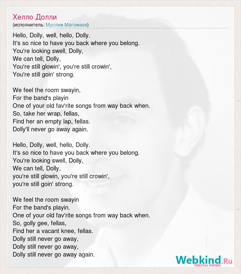 Hello, Dolly, well, hello, Dolly. It's so nice to have you back where you belong. You're looking swell, Dolly, We can tell, Dolly, You're still glowin', you're still crowin', You're still goin' strong. We feel the room swayin, For the band's playin One of your old fav'rite songs from way back when. So, take her wrap, fellas, Find her an empty lap, fellas. Dolly'll never go away again. Hello, Dolly, well, hello, Dolly. It's so nice to have you back where you belong. You're looking swell, Dolly, We can tell, Dolly, you're still glowin, you're still crowin', you're still goin' strong. We feel the room swayin For the band's playin. One of your old fav'rite songs from way back when. So, golly gee, fellas, Find her a vacant knee, fellas. Dolly still never go away, Dolly still never go away, Dolly still never go away again.