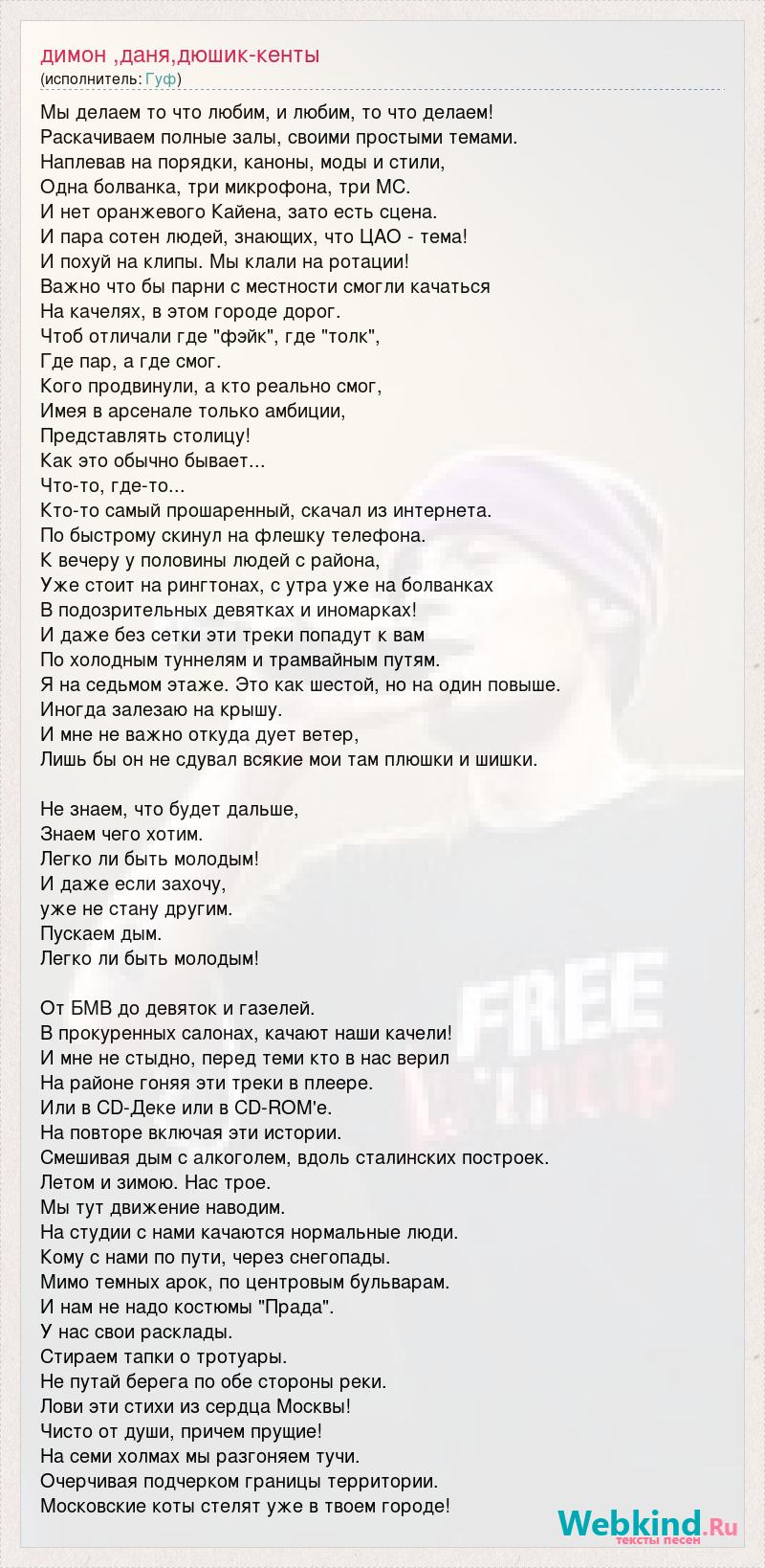 Мы делаем то что любим, и любим, то что делаем! Раскачиваем полные залы, своими простыми темами. Наплевав на порядки, каноны, моды и стили, Одна болванка, три микрофона, три МС. И нет оранжевого Кайена, зато есть сцена. И пара сотен людей, знающих, что ЦАО - тема! И похуй на клипы. Мы клали на ротации! Важно что бы парни с местности смогли качаться На качелях, в этом городе дорог. Чтоб отличали где "фэйк", где "толк", Где пар, а где смог. Кого продвинули, а кто реально смог, Имея в арсенале только амбиции, Представлять столицу! Как это обычно бывает... Что-то, где-то... Кто-то самый прошаренный, скачал из интернета. По быстрому скинул на флешку телефона. К вечеру у половины людей с района, Уже стоит на рингтонах, с утра уже на болванках В подозрительных девятках и иномарках! И даже без сетки эти треки попадут к вам По холодным туннелям и трамвайным путям. Я на седьмом этаже. Это как шестой, но на один повыше. Иногда залезаю на крышу. И мне не важно откуда дует ветер, Лишь бы он не сдувал всякие мои там плюшки и шишки. Не знаем, что будет дальше, Знаем чего хотим. Легко ли быть молодым! И даже если захочу, уже не стану другим. Пускаем дым. Легко ли быть молодым! От БМВ до девяток и газелей. В прокуренных салонах, качают наши качели! И мне не стыдно, перед теми кто в нас верил На районе гоняя эти треки в плеере. Или в CD-Деке или в CD-ROM'е. На повторе включая эти истории. Смешивая дым с алкоголем, вдоль сталинских построек. Летом и зимою. Нас трое. Мы тут движение наводим. На студии с нами качаются нормальные люди. Кому с нами по пути, через снегопады. Мимо темных арок, по центровым бульварам. И нам не надо костюмы "Прада". У нас свои расклады. Стираем тапки о тротуары. Не путай берега по обе стороны реки. Лови эти стихи из сердца Москвы! Чисто от души, причем прущие! На семи холмах мы разгоняем тучи. Очерчивая подчерком границы территории. Московские коты стелят уже в твоем городе!