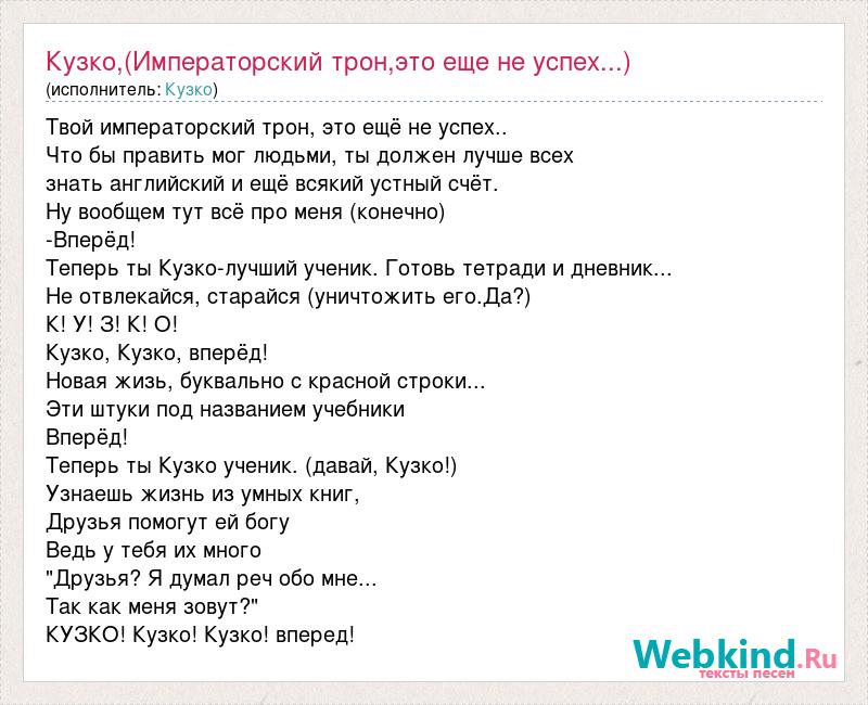 Твой императорский трон, это ещё не успех.. Что бы править мог людьми, ты должен лучше всех знать английский и ещё всякий устный счёт. Ну вообщем тут всё про меня (конечно) -Вперёд! Теперь ты Кузко-лучший ученик. Готовь тетради и дневник... Не отвлекайся, старайся (уничтожить его.Да?) К! У! З! К! О! Кузко, Кузко, вперёд! Новая жизь, буквально с красной строки... Эти штуки под названием учебники Вперёд! Теперь ты Кузко ученик. (давай, Кузко!) Узнаешь жизнь из умных книг, Друзья помогут ей богу Ведь у тебя их много "Друзья? Я думал реч обо мне... Так как меня зовут?" КУЗКО! Кузко! Кузко! вперед!