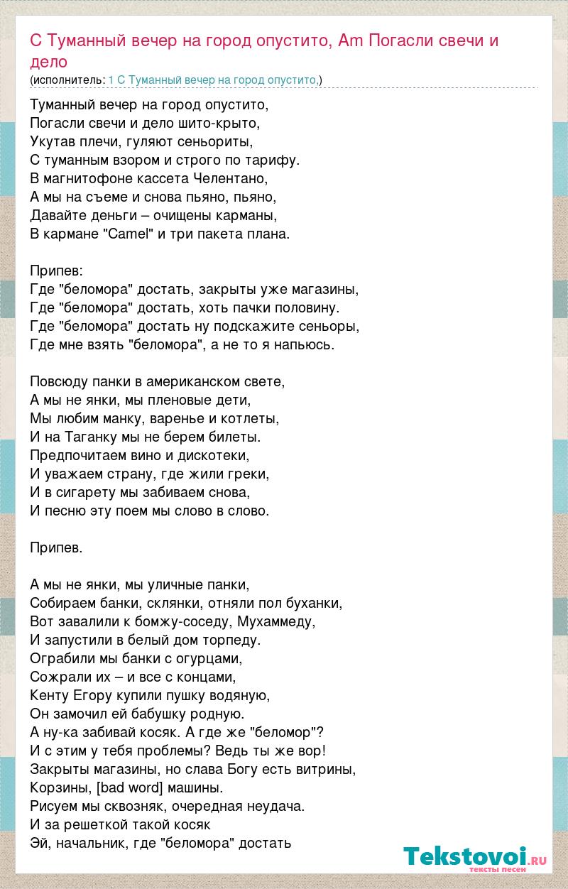 Туманный вечер на город опустито, Погасли свечи и дело шито-крыто, Укутав плечи, гуляют сеньориты, С туманным взором и строго по тарифу. В магнитофоне кассета Челентано, А мы на съеме и снова пьяно, пьяно, Давайте деньги – очищены карманы, В кармане "Camel" и три пакета плана. Припев: Где "беломора" достать, закрыты уже магазины, Где "беломора" достать, хоть пачки половину. Где "беломора" достать ну подскажите сеньоры, Где мне взять "беломора", а не то я напьюсь. Повсюду панки в американском свете, А мы не янки, мы пленовые дети, Мы любим манку, варенье и котлеты, И на Таганку мы не берем билеты. Предпочитаем вино и дискотеки, И уважаем страну, где жили греки, И в сигарету мы забиваем снова, И песню эту поем мы слово в слово. Припев. А мы не янки, мы уличные панки, Собираем банки, склянки, отняли пол буханки, Вот завалили к бомжу-соседу, Мухаммеду, И запустили в белый дом торпеду. Ограбили мы банки с огурцами, Сожрали их – и все с концами, Кенту Егору купили пушку водяную, Он замочил ей бабушку родную. А ну-ка забивай косяк. А где же "беломор"? И с этим у тебя проблемы? Ведь ты же вор! Закрыты магазины, но слава Богу есть витрины, Корзины, [bad word] машины. Рисуем мы сквозняк, очередная неудача. И за решеткой такой косяк Эй, начальник, где "беломора" достать