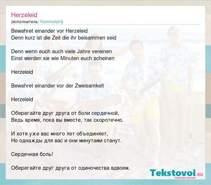 Bewahret einander vor Herzeleid Denn kurz ist die Zeit die ihr beisammen seid Denn wenn euch auch viele Jahre vereinen Einst werden sie wie Minuten euch scheinen Herzeleid Bewahret einander vor der Zweisamkeit Herzeleid Оберегайте друг друга от боли сердечной, Ведь время, пока вы вместе, так скоротечно. И хотя уже вас много лет объединяет, Но однажды для вас и они минутами станут. Сердечная боль! Оберегайте друг друга от одиночества вдвоем.