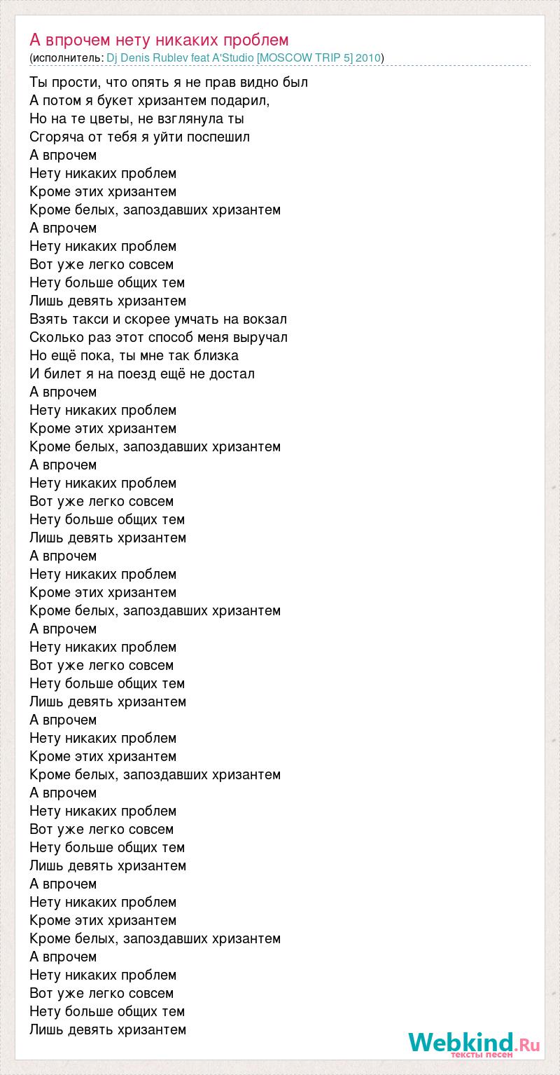 Ты прости, что опять я не прав видно был А потом я букет хризантем подарил, Но на те цветы, не взглянула ты Сгоряча от тебя я уйти поспешил А впрочем Нету никаких проблем Кроме этих хризантем Кроме белых, запоздавших хризантем А впрочем Нету никаких проблем Вот уже легко совсем Нету больше общих тем Лишь девять хризантем Взять такси и скорее умчать на вокзал Сколько раз этот способ меня выручал Но ещё пока, ты мне так близка И билет я на поезд ещё не достал А впрочем Нету никаких проблем Кроме этих хризантем Кроме белых, запоздавших хризантем А впрочем Нету никаких проблем Вот уже легко совсем Нету больше общих тем Лишь девять хризантем А впрочем Нету никаких проблем Кроме этих хризантем Кроме белых, запоздавших хризантем А впрочем Нету никаких проблем Вот уже легко совсем Нету больше общих тем Лишь девять хризантем А впрочем Нету никаких проблем Кроме этих хризантем Кроме белых, запоздавших хризантем А впрочем Нету никаких проблем Вот уже легко совсем Нету больше общих тем Лишь девять хризантем А впрочем Нету никаких проблем Кроме этих хризантем Кроме белых, запоздавших хризантем А впрочем Нету никаких проблем Вот уже легко совсем Нету больше общих тем Лишь девять хризантем