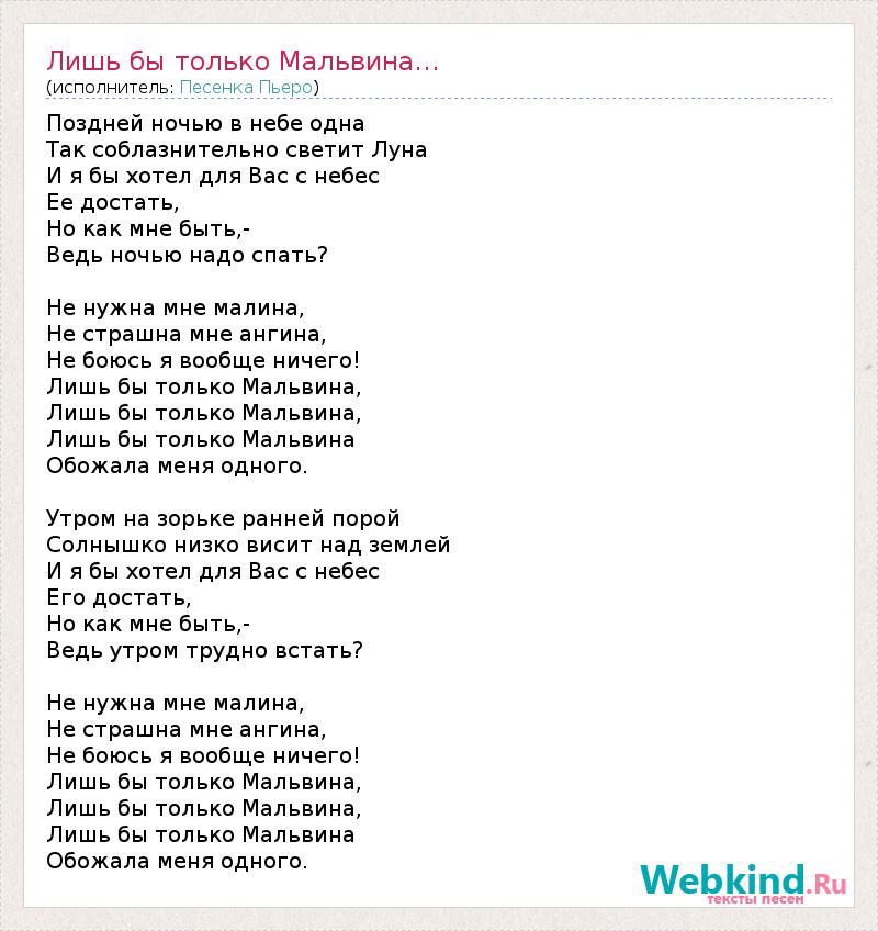 Поздней ночью в небе одна Так соблазнительно светит Луна И я бы хотел для Вас с небес Ее достать, Но как мне быть,- Ведь ночью надо спать? Не нужна мне малина, Не страшна мне ангина, Не боюсь я вообще ничего! Лишь бы только Мальвина, Лишь бы только Мальвина, Лишь бы только Мальвина Обожала меня одного. Утром на зорьке ранней порой Солнышко низко висит над землей И я бы хотел для Вас с небес Его достать, Но как мне быть,- Ведь утром трудно встать? Не нужна мне малина, Не страшна мне ангина, Не боюсь я вообще ничего! Лишь бы только Мальвина, Лишь бы только Мальвина, Лишь бы только Мальвина Обожала меня одного.