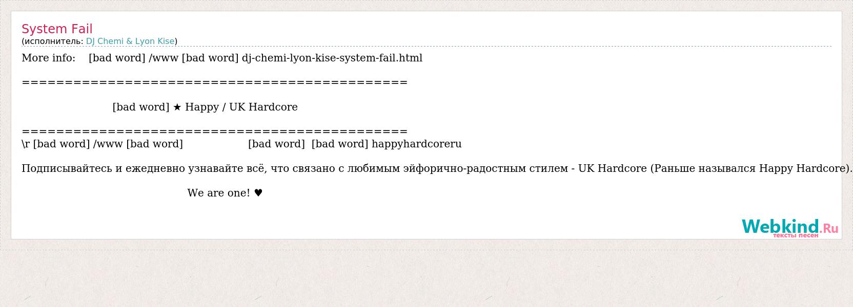 More info: [bad word] /www [bad word] dj-chemi-lyon-kise-system-fail.html ============================================= [bad word] ★ Happy / UK Hardcore ============================================= \r [bad word] /www [bad word] [bad word] [bad word] happyhardcoreru Подписывайтесь и ежедневно узнавайте всё, что связано с любимым эйфорично-радостным стилем - UK Hardcore (Раньше назывался Happy Hardcore). We are one! ♥