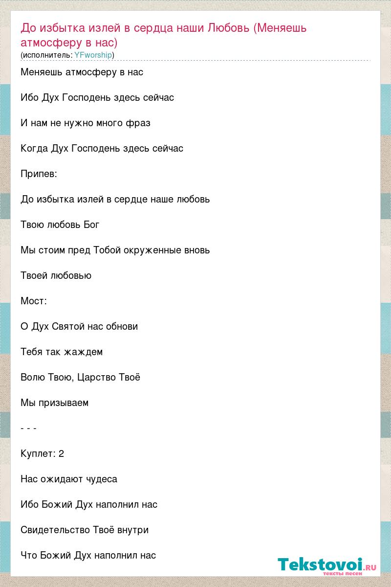 Меняешь атмосферу в нас Ибо Дух Господень здесь сейчас И нам не нужно много фраз Когда Дух Господень здесь сейчас Припев: До избытка излей в сердце наше любовь Твою любовь Бог Мы стоим пред Тобой окруженные вновь Твоей любовью Мост: О Дух Святой нас обнови Тебя так жаждем Волю Твою, Царство Твоё Мы призываем - - - Куплет: 2 Нас ожидают чудеса Ибо Божий Дух наполнил нас Свидетельство Твоё внутри Что Божий Дух наполнил нас