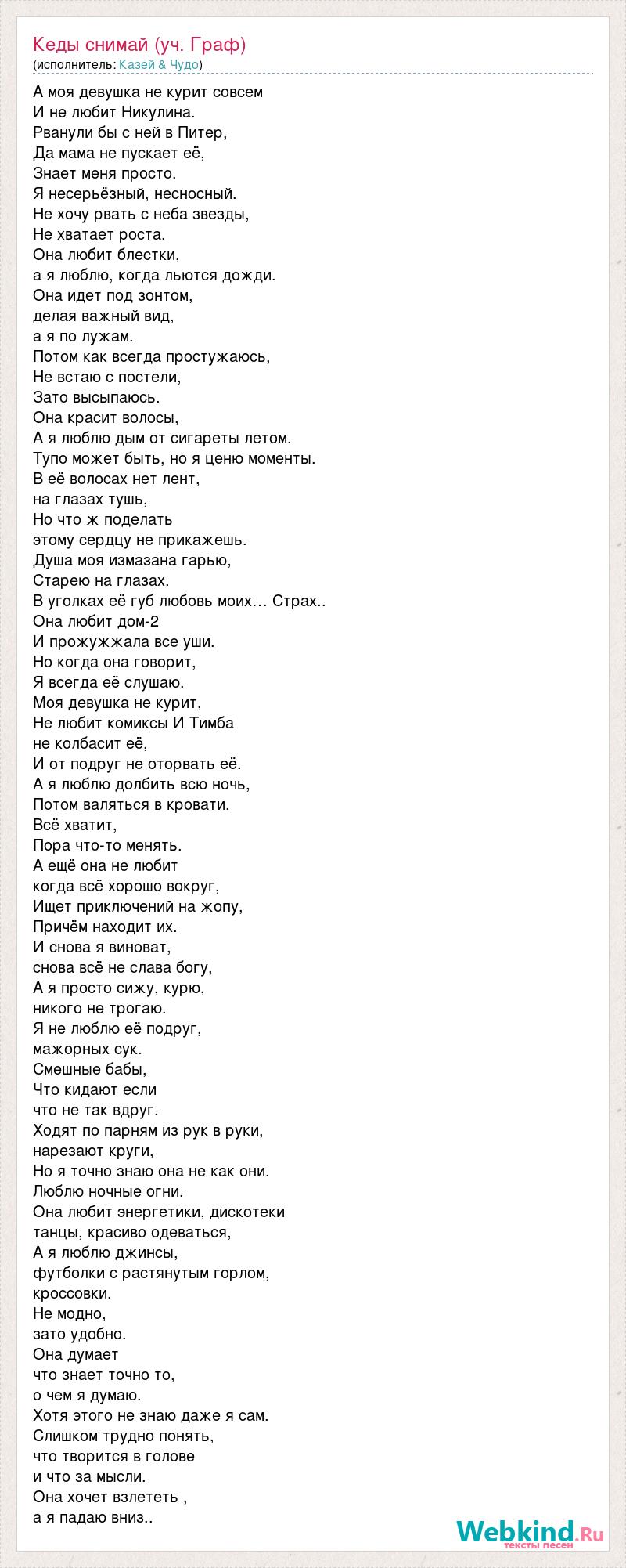А моя девушка не курит совсем И не любит Никулина. Рванули бы с ней в Питер, Да мама не пускает её, Знает меня просто. Я несерьёзный, несносный. Не хочу рвать с неба звезды, Не хватает роста. Она любит блестки, а я люблю, когда льются дожди. Она идет под зонтом, делая важный вид, а я по лужам. Потом как всегда простужаюсь, Не встаю с постели, Зато высыпаюсь. Она красит волосы, А я люблю дым от сигареты летом. Тупо может быть, но я ценю моменты. В её волосах нет лент, на глазах тушь, Но что ж поделать этому сердцу не прикажешь. Душа моя измазана гарью, Старею на глазах. В уголках её губ любовь моих… Страх.. Она любит дом-2 И прожужжала все уши. Но когда она говорит, Я всегда её слушаю. Моя девушка не курит, Не любит комиксы И Тимба не колбасит её, И от подруг не оторвать её. А я люблю долбить всю ночь, Потом валяться в кровати. Всё хватит, Пора что-то менять. А ещё она не любит когда всё хорошо вокруг, Ищет приключений на жопу, Причём находит их. И снова я виноват, снова всё не слава богу, А я просто сижу, курю, никого не трогаю. Я не люблю её подруг, мажорных сук. Смешные бабы, Что кидают если что не так вдруг. Ходят по парням из рук в руки, нарезают круги, Но я точно знаю она не как они. Люблю ночные огни. Она любит энергетики, дискотеки танцы, красиво одеваться, А я люблю джинсы, футболки с растянутым горлом, кроссовки. Не модно, зато удобно. Она думает что знает точно то, о чем я думаю. Хотя этого не знаю даже я сам. Слишком трудно понять, что творится в голове и что за мысли. Она хочет взлететь , а я падаю вниз..