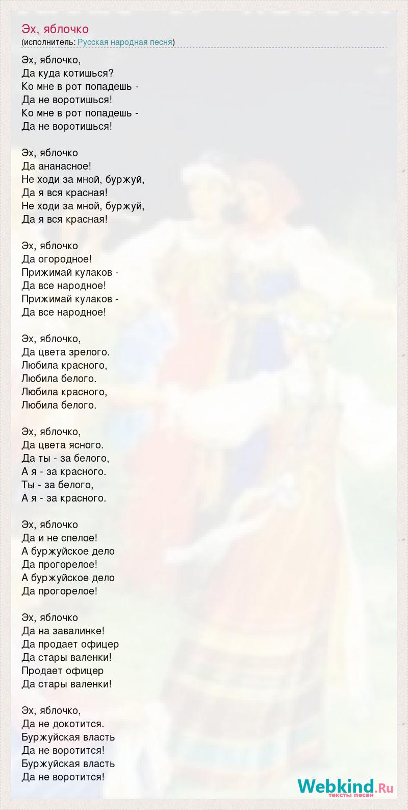 Эх, яблочко, Да куда котишься? Ко мне в рот попадешь - Да не воротишься! Ко мне в рот попадешь - Да не воротишься! Эх, яблочко Да ананасное! Не ходи за мной, буржуй, Да я вся красная! Не ходи за мной, буржуй, Да я вся красная! Эх, яблочко Да огородное! Прижимай кулаков - Да все народное! Прижимай кулаков - Да все народное! Эх, яблочко, Да цвета зрелого. Любила красного, Любила белого. Любила красного, Любила белого. Эх, яблочко, Да цвета ясного. Да ты - за белого, А я - за красного. Ты - за белого, А я - за красного. Эх, яблочко Да и не спелое! А буржуйское дело Да прогорелое! А буржуйское дело Да прогорелое! Эх, яблочко Да на завалинке! Да продает офицер Да стары валенки! Продает офицер Да стары валенки! Эх, яблочко, Да не докотится. Буржуйская власть Да не воротится! Буржуйская власть Да не воротится!