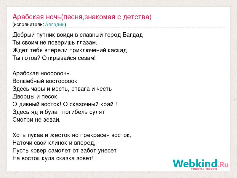 Добрый путник войди в славный город Багдад Ты своим не поверишь глазам. Ждет тебя впереди приключений каскад Ты готов? Открывайся сезам! Арабская ноооооочь Волшебный востооооок Здесь чары и месть, отвага и честь Дворцы и песок. О дивный восток! О сказочный край ! Здесь яд и булат погибель сулят Смотри не зевай. Хоть лукав и жесток но прекрасен восток, Наточи свой клинок и вперед, Пусть ковер самолет от забот унесет На восток куда сказка зовет!