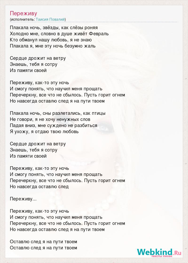 Плакала ночь, звёзды, как слёзы роняя Холодно мне, словно в душе живёт Февраль Кто обманул нашу любовь, я не знаю Плакала я, мне эту ночь безумно жаль Сердце дрожит на ветру Знаешь, тебя я сотру Из памяти своей Переживу, как-то эту ночь И смогу понять, что научил меня прощать Перечеркну, все что не сбылось. Пусть горит огнем Но навсегда оставлю след я на пути твоем Плакала ночь, сны разлетались, как птицы Не говори, я не хочу ненужных слов Падая вниз, мне суждено не разбиться Я ухожу, я отдаю твою любовь Сердце дрожит на ветру Знаешь, тебя я сотру Из памяти своей Переживу, как-то эту ночь И смогу понять, что научил меня прощать Перечеркну, все что не сбылось. Пусть горит огнем Но навсегда оставлю след Переживу... Переживу, как-то эту ночь И смогу понять, что научил меня прощать Перечеркну, все что не сбылось. Пусть горит огнем Но навсегда оставлю след я на пути твоем Оставлю след я на пути твоем Оставлю след я на пути твоем