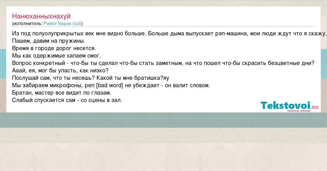 Из под полуолуприкрытых век мне видно больше. Больше дыма выпускает рэп-машина, мои люди ждут что я скажу. Пашем, давим на пружины. Время в городе дорог несется. Мы как одержимые хапаем смог. Вопрос конкретный - что-бы ты сделал что-бы стать заметным, на что пошел что-бы скрасить безцветные дни? Ааай, ея, мог бы упасть, как низко? Послушай сам, что ты несешь? Какой ты мне братишка?яу Мы забираем микрофоны, реп [bad word] не убеждает - он валит словом. Братан, мастер все видит по глазам. Слабый спускается сам - со сцены в зал.