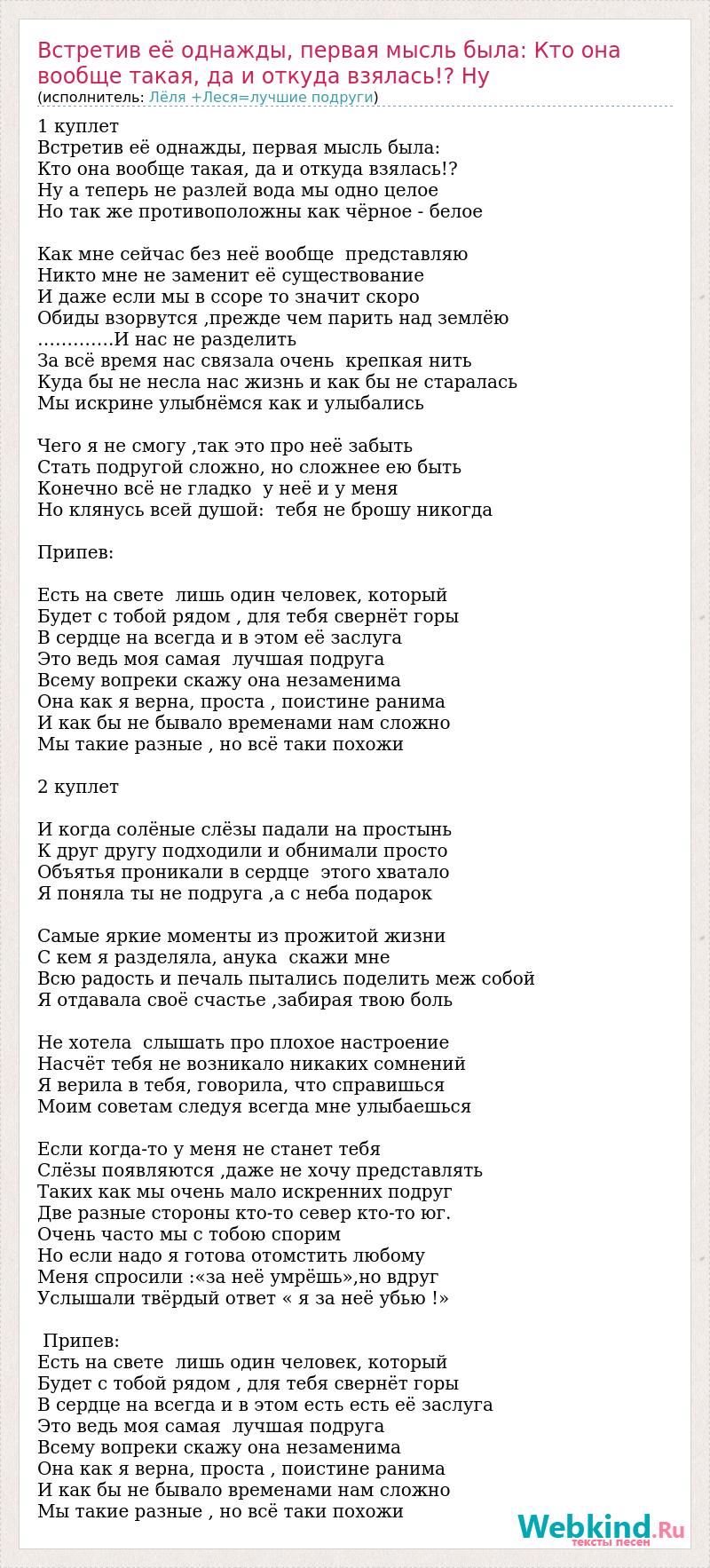 1 куплет Встретив её однажды, первая мысль была: Кто она вообще такая, да и откуда взялась!? Ну а теперь не разлей вода мы одно целое Но так же противоположны как чёрное - белое Как мне сейчас без неё вообще представляю Никто мне не заменит её существование И даже если мы в ссоре то значит скоро Обиды взорвутся ,прежде чем парить над землёю ………….И нас не разделить За всё время нас связала очень крепкая нить Куда бы не несла нас жизнь и как бы не старалась Мы искрине улыбнёмся как и улыбались Чего я не смогу ,так это про неё забыть Стать подругой сложно, но сложнее ею быть Конечно всё не гладко у неё и у меня Но клянусь всей душой: тебя не брошу никогда Припев: Есть на свете лишь один человек, который Будет с тобой рядом , для тебя свернёт горы В сердце на всегда и в этом её заслуга Это ведь моя самая лучшая подруга Всему вопреки скажу она незаменима Она как я верна, проста , поистине ранима И как бы не бывало временами нам сложно Мы такие разные , но всё таки похожи 2 куплет И когда солёные слёзы падали на простынь К друг другу подходили и обнимали просто Объятья проникали в сердце этого хватало Я поняла ты не подруга ,а с неба подарок Самые яркие моменты из прожитой жизни С кем я разделяла, анука скажи мне Всю радость и печаль пытались поделить меж собой Я отдавала своё счастье ,забирая твою боль Не хотела слышать про плохое настроение Насчёт тебя не возникало никаких сомнений Я верила в тебя, говорила, что справишься Моим советам следуя всегда мне улыбаешься Если когда-то у меня не станет тебя Слёзы появляются ,даже не хочу представлять Таких как мы очень мало искренних подруг Две разные стороны кто-то север кто-то юг. Очень часто мы с тобою спорим Но если надо я готова отомстить любому Меня спросили :«за неё умрёшь»,но вдруг Услышали твёрдый ответ « я за неё убью !» Припев: Есть на свете лишь один человек, который Будет с тобой рядом , для тебя свернёт горы В сердце на всегда и в этом есть есть её заслуга Это ведь моя самая лучшая подруга Всему вопреки скажу она незаменима Она как я верна, проста , поистине ранима И как бы не бывало временами нам сложно Мы такие разные , но всё таки похожи