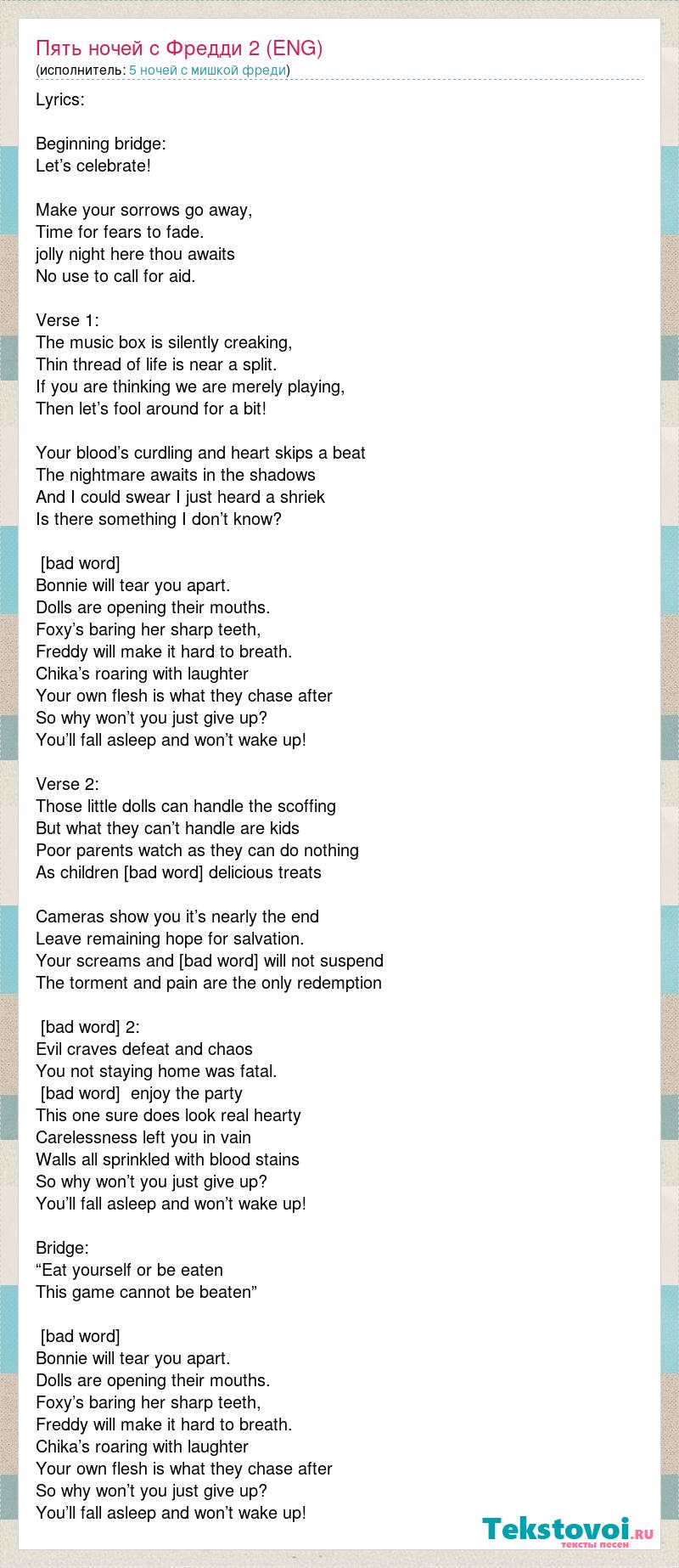 Lyrics: Beginning bridge: Let’s celebrate! Make your sorrows go away, Time for fears to fade. jolly night here thou awaits No use to call for aid. Verse 1: The music box is silently creaking, Thin thread of life is near a split. If you are thinking we are merely playing, Then let’s fool around for a bit! Your blood’s curdling and heart skips a beat The nightmare awaits in the shadows And I could swear I just heard a shriek Is there something I don’t know? [bad word] Bonnie will tear you apart. Dolls are opening their mouths. Foxy’s baring her sharp teeth, Freddy will make it hard to breath. Chika’s roaring with laughter Your own flesh is what they chase after So why won’t you just give up? You’ll fall asleep and won’t wake up! Verse 2: Those little dolls can handle the scoffing But what they can’t handle are kids Poor parents watch as they can do nothing As children [bad word] delicious treats Cameras show you it’s nearly the end Leave remaining hope for salvation. Your screams and [bad word] will not suspend The torment and pain are the only redemption [bad word] 2: Evil craves defeat and chaos You not staying home was fatal. [bad word] enjoy the party This one sure does look real hearty Carelessness left you in vain Walls all sprinkled with blood stains So why won’t you just give up? You’ll fall asleep and won’t wake up! Bridge: “Eat yourself or be eaten This game cannot be beaten” [bad word] Bonnie will tear you apart. Dolls are opening their mouths. Foxy’s baring her sharp teeth, Freddy will make it hard to breath. Chika’s roaring with laughter Your own flesh is what they chase after So why won’t you just give up? You’ll fall asleep and won’t wake up!