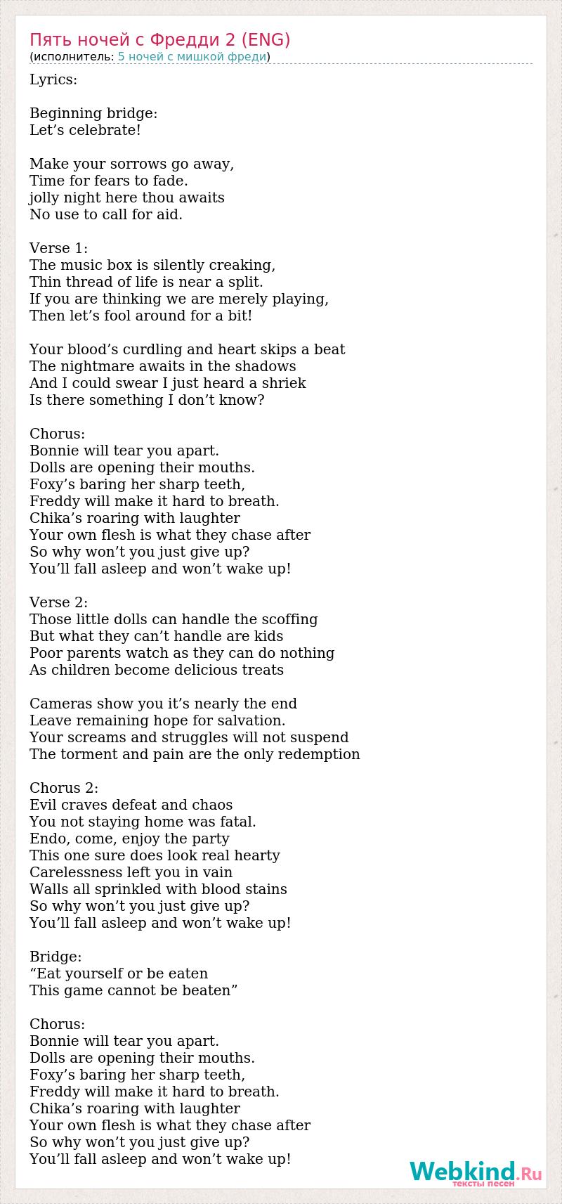 Lyrics: Beginning bridge: Let’s celebrate! Make your sorrows go away, Time for fears to fade. jolly night here thou awaits No use to call for aid. Verse 1: The music box is silently creaking, Thin thread of life is near a split. If you are thinking we are merely playing, Then let’s fool around for a bit! Your blood’s curdling and heart skips a beat The nightmare awaits in the shadows And I could swear I just heard a shriek Is there something I don’t know? Chorus: Bonnie will tear you apart. Dolls are opening their mouths. Foxy’s baring her sharp teeth, Freddy will make it hard to breath. Chika’s roaring with laughter Your own flesh is what they chase after So why won’t you just give up? You’ll fall asleep and won’t wake up! Verse 2: Those little dolls can handle the scoffing But what they can’t handle are kids Poor parents watch as they can do nothing As children become delicious treats Cameras show you it’s nearly the end Leave remaining hope for salvation. Your screams and struggles will not suspend The torment and pain are the only redemption Chorus 2: Evil craves defeat and chaos You not staying home was fatal. Endo, come, enjoy the party This one sure does look real hearty Carelessness left you in vain Walls all sprinkled with blood stains So why won’t you just give up? You’ll fall asleep and won’t wake up! Bridge: “Eat yourself or be eaten This game cannot be beaten” Chorus: Bonnie will tear you apart. Dolls are opening their mouths. Foxy’s baring her sharp teeth, Freddy will make it hard to breath. Chika’s roaring with laughter Your own flesh is what they chase after So why won’t you just give up? You’ll fall asleep and won’t wake up!