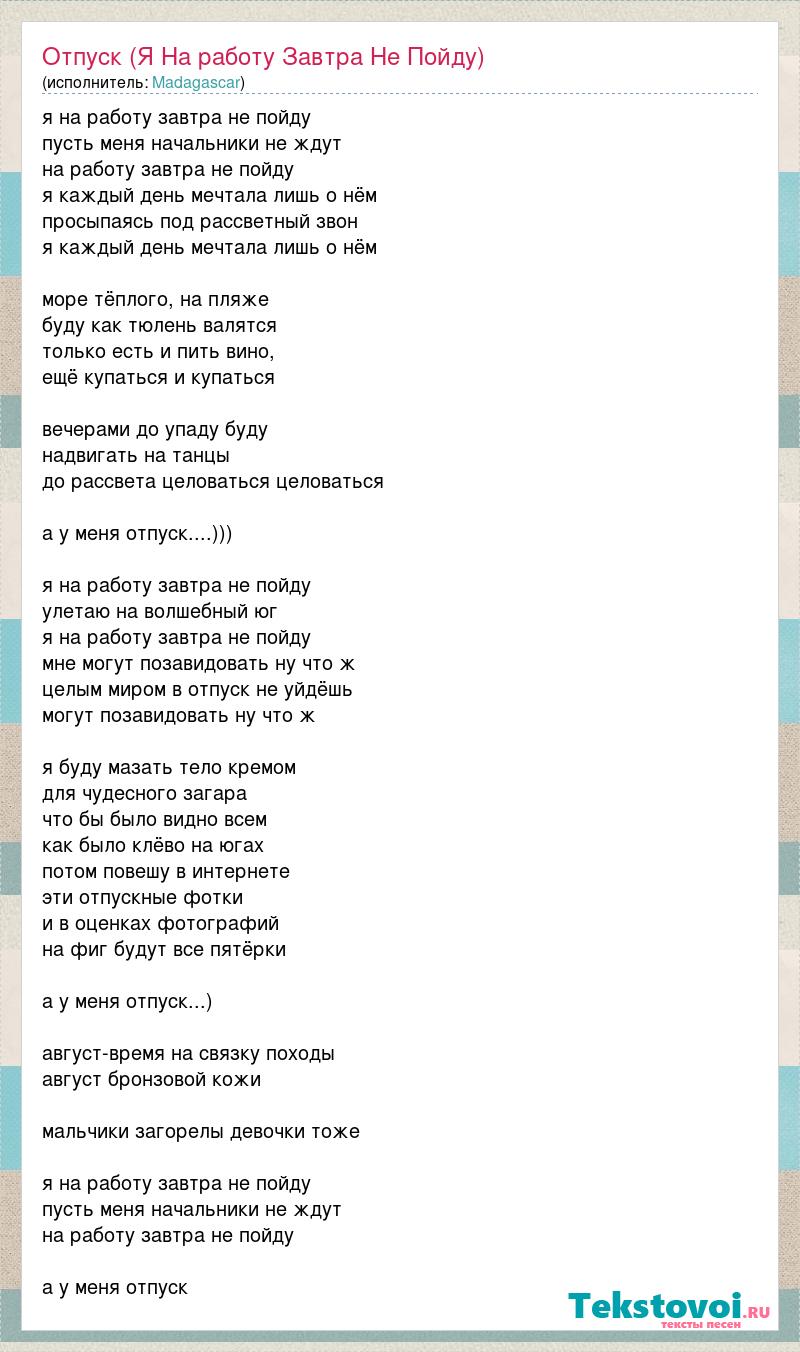 я на работу завтра не пойду пусть меня начальники не ждут на работу завтра не пойду я каждый день мечтала лишь о нём просыпаясь под рассветный звон я каждый день мечтала лишь о нём море тёплого, на пляже буду как тюлень валятся только есть и пить вино, ещё купаться и купаться вечерами до упаду буду надвигать на танцы до рассвета целоваться целоваться а у меня отпуск....))) я на работу завтра не пойду улетаю на волшебный юг я на работу завтра не пойду мне могут позавидовать ну что ж целым миром в отпуск не уйдёшь могут позавидовать ну что ж я буду мазать тело кремом для чудесного загара что бы было видно всем как было клёво на югах потом повешу в интернете эти отпускные фотки и в оценках фотографий на фиг будут все пятёрки а у меня отпуск...) август-время на связку походы август бронзовой кожи мальчики загорелы девочки тоже я на работу завтра не пойду пусть меня начальники не ждут на работу завтра не пойду а у меня отпуск