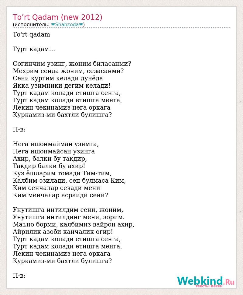 To'rt qadam Турт кадам… Согинчим узинг, жоним биласанми? Мехрим сенда жоним, сезасанми? Сени кургим келади дунёда Якка узимники дегим келади! Турт кадам колади етишга сенга, Турт кадам колади етишга менга, Лекин чекинамиз нега оркага Куркамиз-ми бахтли булишга? П-в: Нега ишонмайман узимга, Нега ишонмайсан узинга Ахир, балки бу такдир, Такдир балки бу ахир! Куз ёшларим томади Тим-тим, Калбим эзилади, сен булмаса Ким, Ким сенчалар севади мени Ким менчалар асрайди сени? Унутишга интилдим сени, жоним, Унутишга интилдинг мени, зорим. Маъно борми, калбимиз вайрон ахир, Айрилик азоби канчалик огир! Турт кадам колади етишга сенга, Турт кадам колади етишга менга, Лекин чекинамиз нега оркага Куркамиз-ми бахтли булишга? П-в: