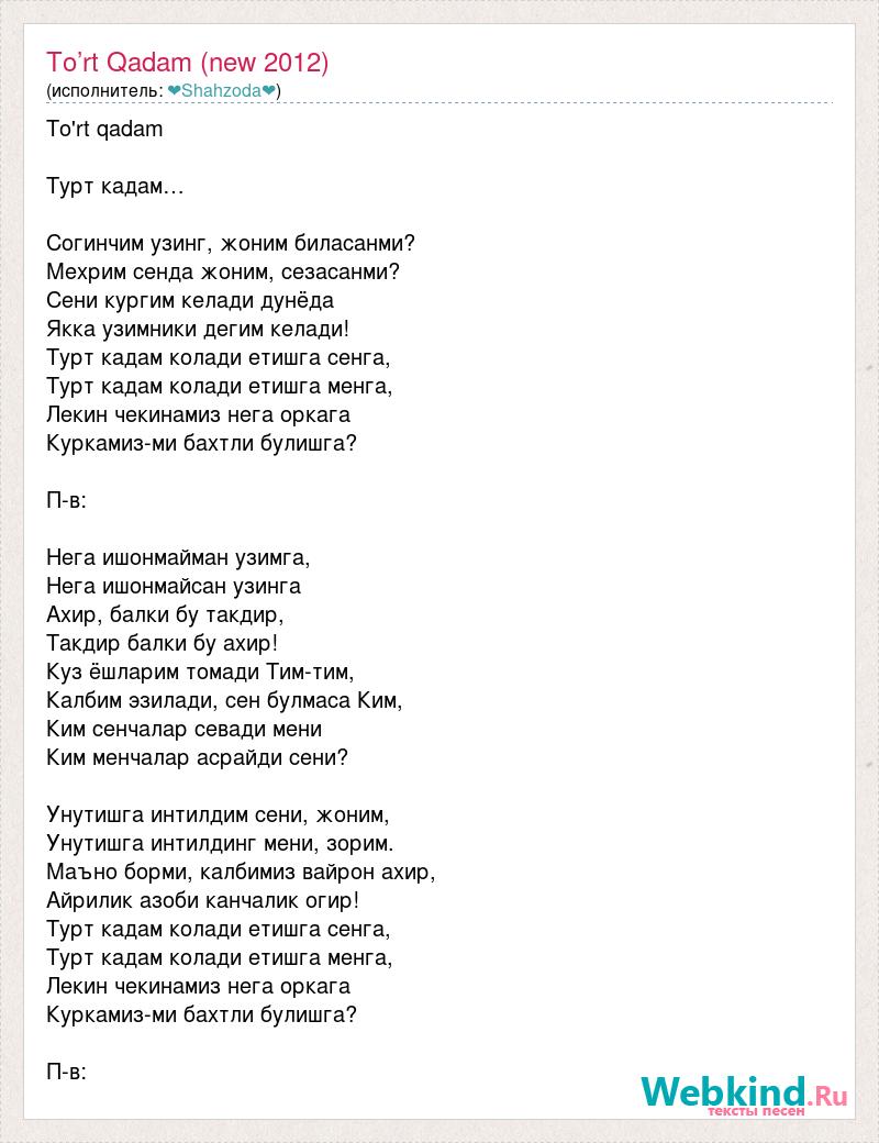 To'rt qadam Турт кадам… Согинчим узинг, жоним биласанми? Мехрим сенда жоним, сезасанми? Сени кургим келади дунёда Якка узимники дегим келади! Турт кадам колади етишга сенга, Турт кадам колади етишга менга, Лекин чекинамиз нега оркага Куркамиз-ми бахтли булишга? П-в: Нега ишонмайман узимга, Нега ишонмайсан узинга Ахир, балки бу такдир, Такдир балки бу ахир! Куз ёшларим томади Тим-тим, Калбим эзилади, сен булмаса Ким, Ким сенчалар севади мени Ким менчалар асрайди сени? Унутишга интилдим сени, жоним, Унутишга интилдинг мени, зорим. Маъно борми, калбимиз вайрон ахир, Айрилик азоби канчалик огир! Турт кадам колади етишга сенга, Турт кадам колади етишга менга, Лекин чекинамиз нега оркага Куркамиз-ми бахтли булишга? П-в: