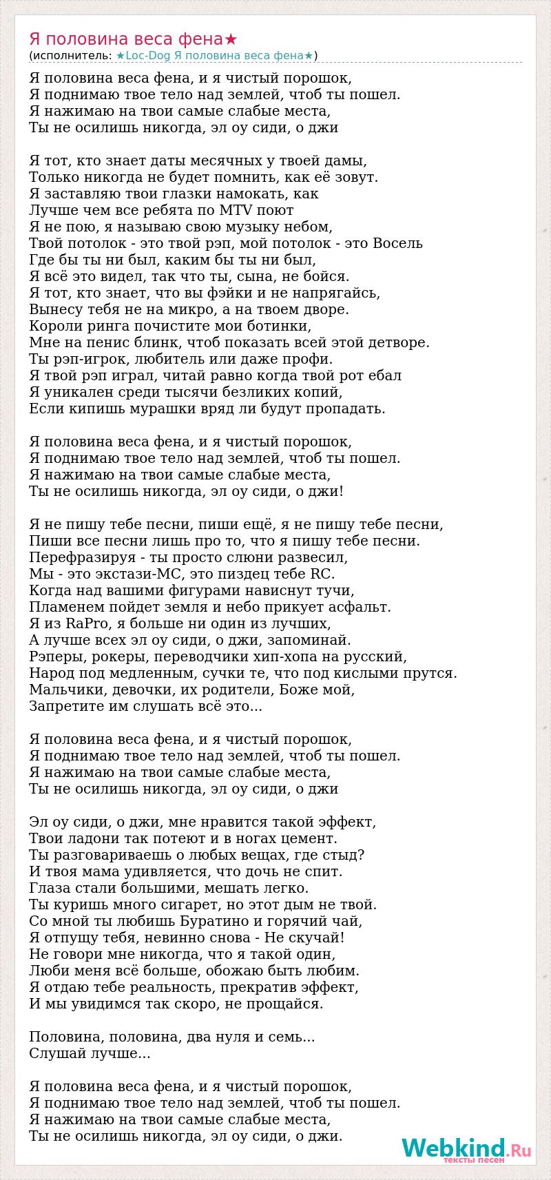 Я половина веса фена, и я чистый порошок, Я поднимаю твое тело над землей, чтоб ты пошел. Я нажимаю на твои самые слабые места, Ты не осилишь никогда, эл оу сиди, о джи Я тот, кто знает даты месячных у твоей дамы, Только никогда не будет помнить, как её зовут. Я заставляю твои глазки намокать, как Лучше чем все ребята по MTV поют Я не пою, я называю свою музыку небом, Твой потолок - это твой рэп, мой потолок - это Восель Где бы ты ни был, каким бы ты ни был, Я всё это видел, так что ты, сына, не бойся. Я тот, кто знает, что вы фэйки и не напрягайсь, Вынесу тебя не на микро, а на твоем дворе. Короли ринга почистите мои ботинки, Мне на пенис блинк, чтоб показать всей этой детворе. Ты рэп-игрок, любитель или даже профи. Я твой рэп играл, читай равно когда твой рот ебал Я уникален среди тысячи безликих копий, Если кипишь мурашки вряд ли будут пропадать. Я половина веса фена, и я чистый порошок, Я поднимаю твое тело над землей, чтоб ты пошел. Я нажимаю на твои самые слабые места, Ты не осилишь никогда, эл оу сиди, о джи! Я не пишу тебе песни, пиши ещё, я не пишу тебе песни, Пиши все песни лишь про то, что я пишу тебе песни. Перефразируя - ты просто слюни развесил, Мы - это экстази-МС, это пиздец тебе RС. Когда над вашими фигурами нависнут тучи, Пламенем пойдет земля и небо прикует асфальт. Я из RaPro, я больше ни один из лучших, А лучше всех эл оу сиди, о джи, запоминай. Рэперы, рокеры, переводчики хип-хопа на русский, Народ под медленным, сучки те, что под кислыми прутся. Мальчики, девочки, их родители, Боже мой, Запретите им слушать всё это... Я половина веса фена, и я чистый порошок, Я поднимаю твое тело над землей, чтоб ты пошел. Я нажимаю на твои самые слабые места, Ты не осилишь никогда, эл оу сиди, о джи Эл оу сиди, о джи, мне нравится такой эффект, Твои ладони так потеют и в ногах цемент. Ты разговариваешь о любых вещах, где стыд? И твоя мама удивляется, что дочь не спит. Глаза стали большими, мешать легко. Ты куришь много сигарет, но этот дым не твой. Со мной ты любишь Буратино и горячий чай, Я отпущу тебя, невинно снова - Не скучай! Не говори мне никогда, что я такой один, Люби меня всё больше, обожаю быть любим. Я отдаю тебе реальность, прекратив эффект, И мы увидимся так скоро, не прощайся. Половина, половина, два нуля и семь... Слушай лучше... Я половина веса фена, и я чистый порошок, Я поднимаю твое тело над землей, чтоб ты пошел. Я нажимаю на твои самые слабые места, Ты не осилишь никогда, эл оу сиди, о джи.