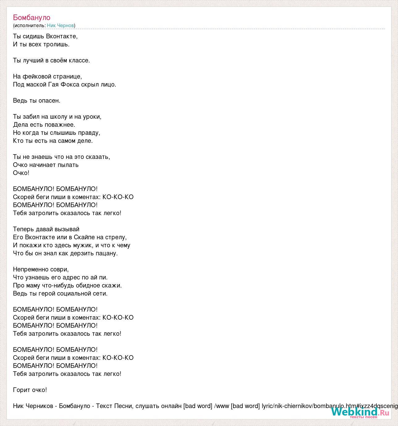 Ты сидишь Вконтакте, И ты всех тролишь. Ты лучший в своём классе. На фейковой странице, Под маской Гая Фокса скрыл лицо. Ведь ты опасен. Ты забил на школу и на уроки, Дела есть поважнее. Но когда ты слышишь правду, Кто ты есть на самом деле. Ты не знаешь что на это сказать, Очко начинает пылать Очко! БОМБАНУЛО! БОМБАНУЛО! Скорей беги пиши в коментах: КО-КО-КО БОМБАНУЛО! БОМБАНУЛО! Тебя затролить оказалось так легко! Теперь давай вызывай Его Вконтакте или в Скайпе на стрелу, И покажи кто здесь мужик, и что к чему Что бы он знал как дерзить пацану. Непременно соври, Что узнаешь его адрес по ай пи. Про маму что-нибудь обидное скажи. Ведь ты герой социальной сети. БОМБАНУЛО! БОМБАНУЛО! Скорей беги пиши в коментах: КО-КО-КО БОМБАНУЛО! БОМБАНУЛО! Тебя затролить оказалось так легко! БОМБАНУЛО! БОМБАНУЛО! Скорей беги пиши в коментах: КО-КО-КО БОМБАНУЛО! БОМБАНУЛО! Тебя затролить оказалось так легко! Горит очко! Ник Черников - Бомбануло - Текст Песни, слушать онлайн [bad word] /www [bad word] lyric/nik-chiernikov/bombanulo.htm#ixzz4dqscenig