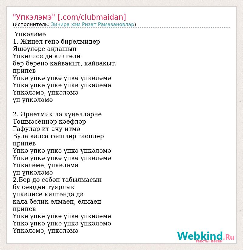 🎹 Үпкәләмә 🎹 1. Җиңел генә бирелмидер Яшәүләре аңлашып Үпкәлисе дә килгәли бер береңә кайвакыт, кайвакыт. припев Үпкә үпкә үпкә үпкә үпкәләмә Үпкә үпкә үпкә үпкә үпкәләмә Үпкәләмә, үпкәләмә үп үпкәләмә 2. Әрнетмик лә күңелләрне Төшмәсеннәр кәефләр Гафулар ит ачу итмә Була калса гаепләр гаепләр припев Үпкә үпкә үпкә үпкә үпкәләмә Үпкә үпкә үпкә үпкә үпкәләмә Үпкәләмә, үпкәләмә үп үпкәләмә 2.Бер дә сәбәп табылмасын бу сөюдән туярлык үпкәлисе килгәндә дә кала белик елмаеп, елмаеп припев Үпкә үпкә үпкә үпкә үпкәләмә Үпкә үпкә үпкә үпкә үпкәләмә Үпкәләмә, үпкәләмә