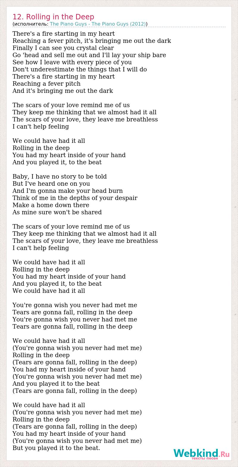 There's a fire starting in my heart Reaching a fever pitch, it's bringing me out the dark Finally I can see you crystal clear Go 'head and sell me out and I'll lay your ship bare See how I leave with every piece of you Don't underestimate the things that I will do There's a fire starting in my heart Reaching a fever pitch And it's bringing me out the dark The scars of your love remind me of us They keep me thinking that we almost had it all The scars of your love, they leave me breathless I can't help feeling We could have had it all Rolling in the deep You had my heart inside of your hand And you played it, to the beat Baby, I have no story to be told But I've heard one on you And I'm gonna make your head burn Think of me in the depths of your despair Make a home down there As mine sure won't be shared The scars of your love remind me of us They keep me thinking that we almost had it all The scars of your love, they leave me breathless I can't help feeling We could have had it all Rolling in the deep You had my heart inside of your hand And you played it, to the beat We could have had it all You're gonna wish you never had met me Tears are gonna fall, rolling in the deep You're gonna wish you never had met me Tears are gonna fall, rolling in the deep We could have had it all (You're gonna wish you never had met me) Rolling in the deep (Tears are gonna fall, rolling in the deep) You had my heart inside of your hand (You're gonna wish you never had met me) And you played it to the beat (Tears are gonna fall, rolling in the deep) We could have had it all (You're gonna wish you never had met me) Rolling in the deep (Tears are gonna fall, rolling in the deep) You had my heart inside of your hand (You're gonna wish you never had met me) But you played it to the beat.