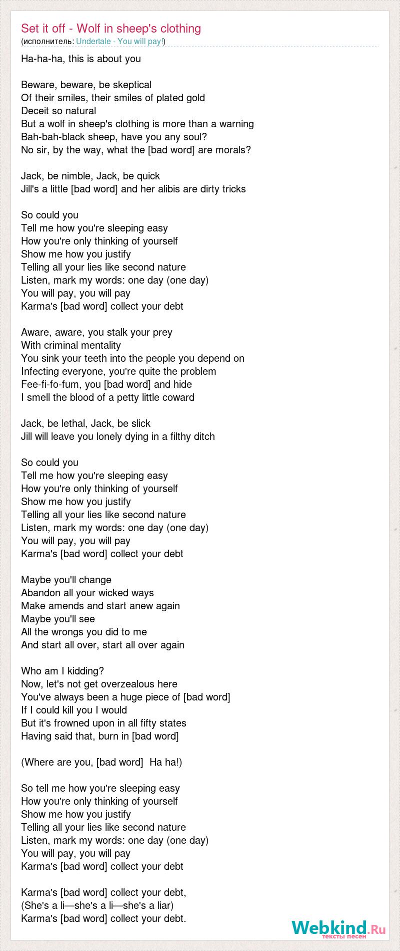 Ha-ha-ha, this is about you Beware, beware, be skeptical Of their smiles, their smiles of plated gold Deceit so natural But a wolf in sheep's clothing is more than a warning Bah-bah-black sheep, have you any soul? No sir, by the way, what the [bad word] are morals? Jack, be nimble, Jack, be quick Jill's a little [bad word] and her alibis are dirty tricks So could you Tell me how you're sleeping easy How you're only thinking of yourself Show me how you justify Telling all your lies like second nature Listen, mark my words: one day (one day) You will pay, you will pay Karma's [bad word] collect your debt Aware, aware, you stalk your prey With criminal mentality You sink your teeth into the people you depend on Infecting everyone, you're quite the problem Fee-fi-fo-fum, you [bad word] and hide I smell the blood of a petty little coward Jack, be lethal, Jack, be slick Jill will leave you lonely dying in a filthy ditch So could you Tell me how you're sleeping easy How you're only thinking of yourself Show me how you justify Telling all your lies like second nature Listen, mark my words: one day (one day) You will pay, you will pay Karma's [bad word] collect your debt Maybe you'll change Abandon all your wicked ways Make amends and start anew again Maybe you'll see All the wrongs you did to me And start all over, start all over again Who am I kidding? Now, let's not get overzealous here You've always been a huge piece of [bad word] If I could kill you I would But it's frowned upon in all fifty states Having said that, burn in [bad word] (Where are you, [bad word] Ha ha!) So tell me how you're sleeping easy How you're only thinking of yourself Show me how you justify Telling all your lies like second nature Listen, mark my words: one day (one day) You will pay, you will pay Karma's [bad word] collect your debt Karma's [bad word] collect your debt, (She's a li—she's a li—she's a liar) Karma's [bad word] collect your debt.