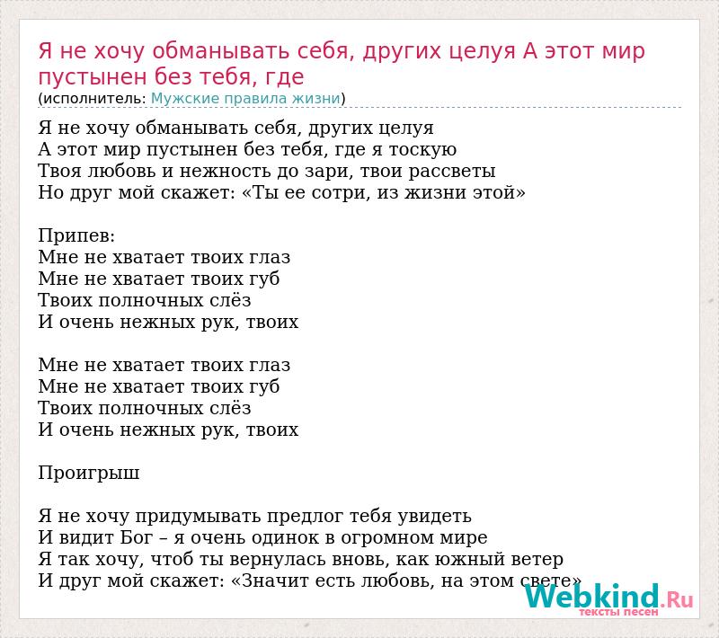 Я не хочу обманывать себя, других целуя А этот мир пустынен без тебя, где я тоскую Твоя любовь и нежность до зари, твои рассветы Но друг мой скажет: «Ты ее сотри, из жизни этой» Припев: Мне не хватает твоих глаз Мне не хватает твоих губ Твоих полночных слёз И очень нежных рук, твоих Мне не хватает твоих глаз Мне не хватает твоих губ Твоих полночных слёз И очень нежных рук, твоих Проигрыш Я не хочу придумывать предлог тебя увидеть И видит Бог – я очень одинок в огромном мире Я так хочу, чтоб ты вернулась вновь, как южный ветер И друг мой скажет: «Значит есть любовь, на этом свете»