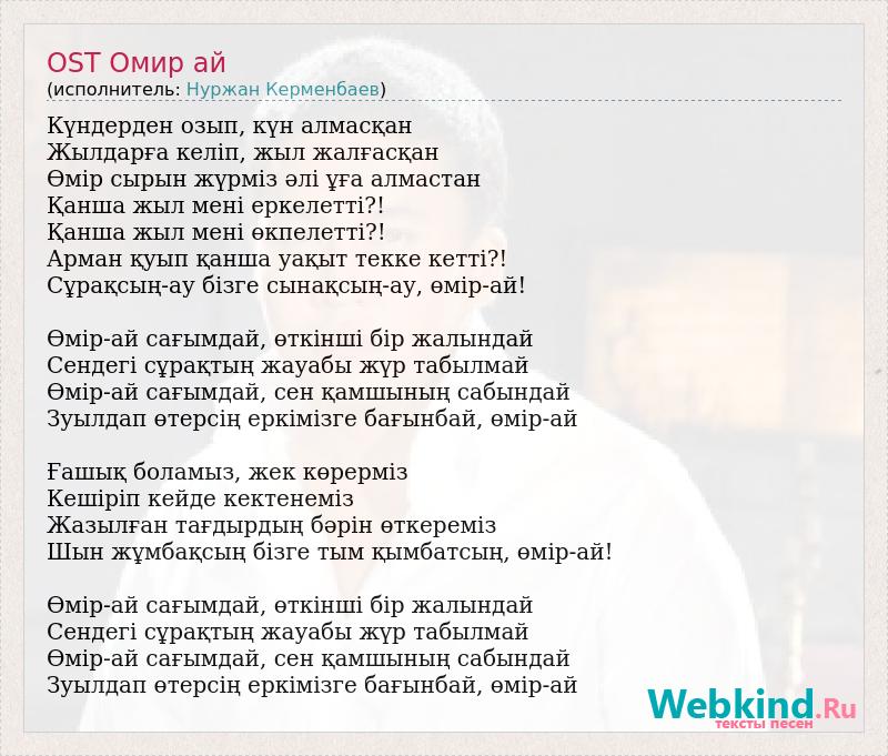 Күндерден озып, күн алмасқан Жылдарға келіп, жыл жалғасқан Өмір сырын жүрміз әлі ұға алмастан Қанша жыл мені еркелетті?! Қанша жыл мені өкпелетті?! Арман қуып қанша уақыт текке кетті?! Сұрақсың-ау бізге сынақсың-ау, өмір-ай! Өмір-ай сағымдай, өткінші бір жалындай Сендегі сұрақтың жауабы жүр табылмай Өмір-ай сағымдай, сен қамшының сабындай Зуылдап өтерсің еркімізге бағынбай, өмір-ай Ғашық боламыз, жек көрерміз Кешіріп кейде кектенеміз Жазылған тағдырдың бәрін өткереміз Шын жұмбақсың бізге тым қымбатсың, өмір-ай! Өмір-ай сағымдай, өткінші бір жалындай Сендегі сұрақтың жауабы жүр табылмай Өмір-ай сағымдай, сен қамшының сабындай Зуылдап өтерсің еркімізге бағынбай, өмір-ай