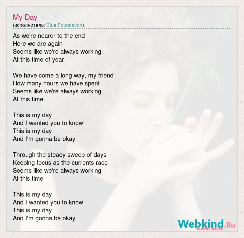 As we're nearer to the end Here we are again Seems like we're always working At this time of year We have come a long way, my friend How many hours we have spent Seems like we're always working At this time This is my day And I wanted you to know This is my day And I'm gonna be okay Through the steady sweep of days Keeping focus as the currents race Seems like we're always working At this time This is my day And I wanted you to know This is my day And I'm gonna be okay