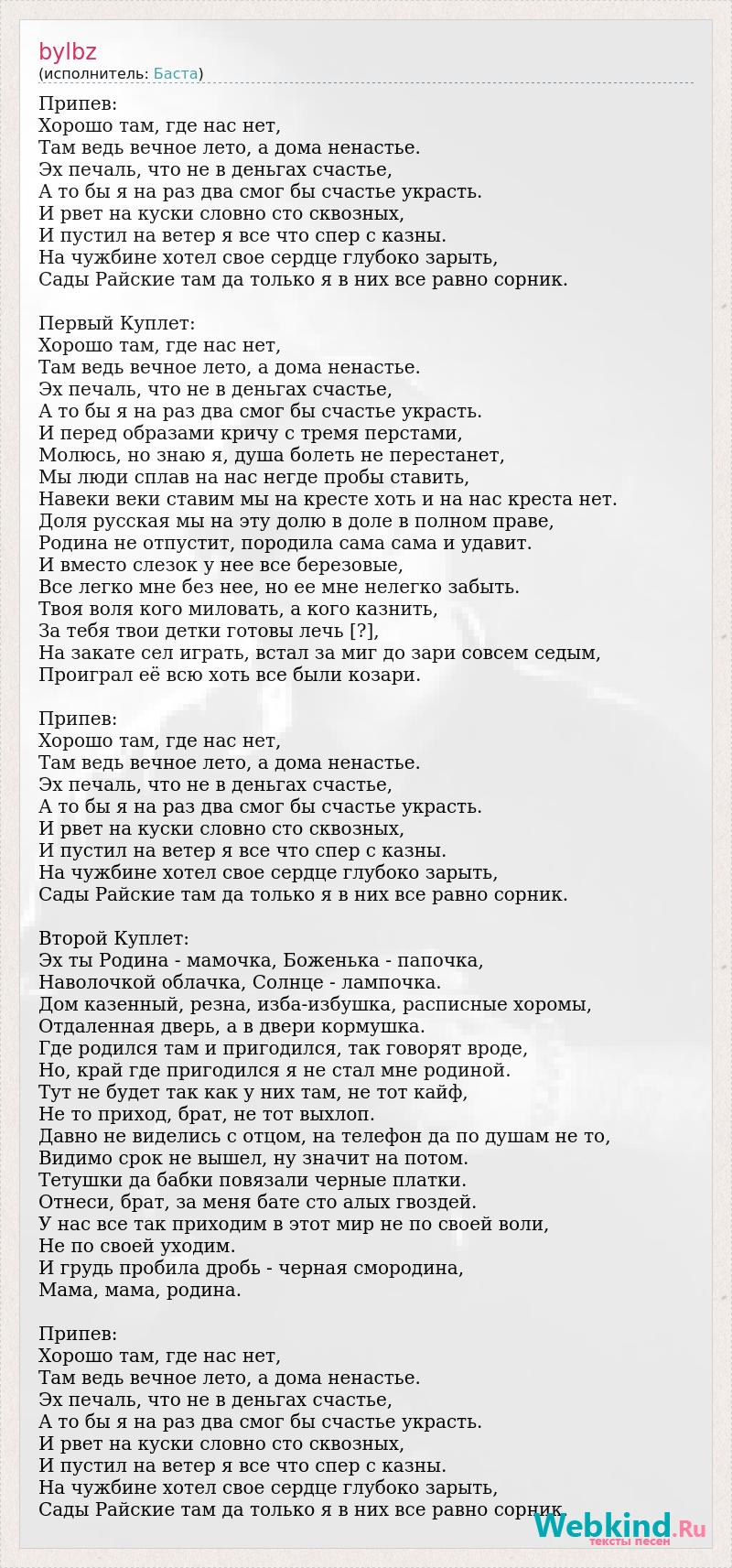 Припев: Хорошо там, где нас нет, Там ведь вечное лето, а дома ненастье. Эх печаль, что не в деньгах счастье, А то бы я на раз два смог бы счастье украсть. И рвет на куски словно сто сквозных, И пустил на ветер я все что спер с казны. На чужбине хотел свое сердце глубоко зарыть, Сады Райские там да только я в них все равно сорник. Первый Куплет: Хорошо там, где нас нет, Там ведь вечное лето, а дома ненастье. Эх печаль, что не в деньгах счастье, А то бы я на раз два смог бы счастье украсть. И перед образами кричу с тремя перстами, Молюсь, но знаю я, душа болеть не перестанет, Мы люди сплав на нас негде пробы ставить, Навеки веки ставим мы на кресте хоть и на нас креста нет. Доля русская мы на эту долю в доле в полном праве, Родина не отпустит, породила сама сама и удавит. И вместо слезок у нее все березовые, Все легко мне без нее, но ее мне нелегко забыть. Твоя воля кого миловать, а кого казнить, За тебя твои детки готовы лечь [?], На закате сел играть, встал за миг до зари совсем седым, Проиграл её всю хоть все были козари. Припев: Хорошо там, где нас нет, Там ведь вечное лето, а дома ненастье. Эх печаль, что не в деньгах счастье, А то бы я на раз два смог бы счастье украсть. И рвет на куски словно сто сквозных, И пустил на ветер я все что спер с казны. На чужбине хотел свое сердце глубоко зарыть, Сады Райские там да только я в них все равно сорник. Второй Куплет: Эх ты Родина - мамочка, Боженька - папочка, Наволочкой облачка, Солнце - лампочка. Дом казенный, резна, изба-избушка, расписные хоромы, Отдаленная дверь, а в двери кормушка. Где родился там и пригодился, так говорят вроде, Но, край где пригодился я не стал мне родиной. Тут не будет так как у них там, не тот кайф, Не то приход, брат, не тот выхлоп. Давно не виделись с отцом, на телефон да по душам не то, Видимо срок не вышел, ну значит на потом. Тетушки да бабки повязали черные платки. Отнеси, брат, за меня бате сто алых гвоздей. У нас все так приходим в этот мир не по своей воли, Не по своей уходим. И грудь пробила дробь - черная смородина, Мама, мама, родина. Припев: Хорошо там, где нас нет, Там ведь вечное лето, а дома ненастье. Эх печаль, что не в деньгах счастье, А то бы я на раз два смог бы счастье украсть. И рвет на куски словно сто сквозных, И пустил на ветер я все что спер с казны. На чужбине хотел свое сердце глубоко зарыть, Сады Райские там да только я в них все равно сорник.
