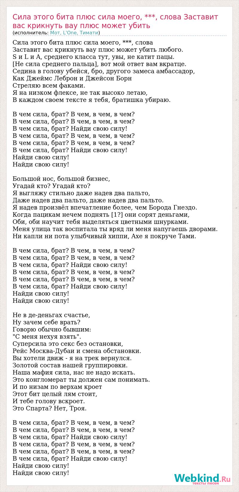 Сила этого бита плюс сила моего, ***, слова Заставит вас крикнуть вау плюс может убить любого. S и L и A, среднего класса тут, увы, не катит пацы. [Не сила среднего пальца], вот мой ответ вам вкратце. Седина в голову убейся, бро, другого замеса амбассадор, Как Джеймс Леброн и Джейсон Борн Стреляю всем факами. Я на низком флексе, не так высоко летаю, В каждом своем тексте я тебя, братишка убираю. В чем сила, брат? В чем, в чем, в чем? В чем сила, брат? В чем, в чем, в чем? В чем сила, брат? Найди свою силу! В чем сила, брат? В чем, в чем, в чем? В чем сила, брат? В чем, в чем, в чем? В чем сила, брат? Найди свою силу! Найди свою силу! Найди свою силу! Большой нос, большой бизнес, Угадай кто? Угадай кто? Я выгляжу стильно даже надев два пальто, Даже надев два пальто, даже надев два пальто. Я надев произвёл впечатление более, чем Борода Гнездо. Когда пацикам нечем поднять [1?] они сорят деньгами, Оби, оби научит тебя выделяться цветными шнурками. Меня улица так воспитала ты вряд ли меня напугаешь дворами. Ни капли ни пота улыбчивый хиппи, Axe я покруче Тами. В чем сила, брат? В чем, в чем, в чем? В чем сила, брат? В чем, в чем, в чем? В чем сила, брат? Найди свою силу! В чем сила, брат? В чем, в чем, в чем? В чем сила, брат? В чем, в чем, в чем? В чем сила, брат? Найди свою силу! Найди свою силу! Найди свою силу! Не в де-деньгах счастье, Ну зачем себе врать? Говорю обычно бывшим: "С меня нехуя взять". Суперсила это секс без остановки, Рейс Москва-Дубаи и смена обстановки. Вы хотели движ - я на трек вернулся. Золотой состав нашей группировки. Наша мафия сила, нас не надо искать. Это конгломерат ты должен сам понимать. И по низам по верхам кроет Этот бит целый лям стоит, И тебе голову вскроет. Это Спарта? Нет, Троя. В чем сила, брат? В чем, в чем, в чем? В чем сила, брат? В чем, в чем, в чем? В чем сила, брат? Найди свою силу! В чем сила, брат? В чем, в чем, в чем? В чем сила, брат? В чем, в чем, в чем? В чем сила, брат? Найди свою силу! Найди свою силу! Найди свою силу!