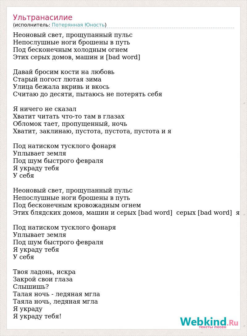 Неоновый свет, прощупанный пульс Непослушные ноги брошены в путь Под бесконечным холодным огнем Этих серых домов, машин и [bad word] Давай бросим кости на любовь Старый погост лютая зима Улица бежала вкривь и вкось Считаю до десяти, пытаюсь не потерять себя Я ничего не сказал Хватит читать что-то там в глазах Обломок тает, пропущенный, ночь Хватит, заклинаю, пустота, пустота, пустота и я Под натиском тусклого фонаря Уплывает земля Под шум быстрого февраля Я украду тебя У себя Неоновый свет, прощупанный пульс Непослушные ноги брошены в путь Под бесконечным кровожадным огнем Этих блядских домов, машин и серых [bad word] серых [bad word] я Под натиском тусклого фонаря Уплывает земля Под шум быстрого февраля Я украду тебя У себя Твоя ладонь, искра Закрой свои глаза Слышишь? Талая ночь - ледяная мгла Таяла ночь, ледяная мгла Я украду Я украду тебя!