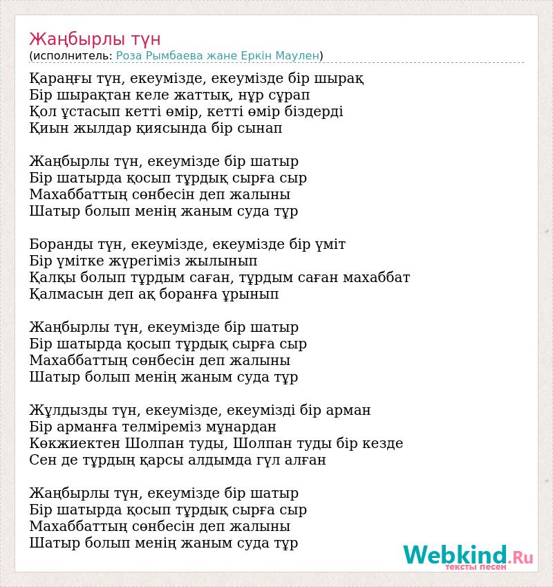 Қараңғы түн, екеумізде, екеумізде бір шырақ Бір шырақтан келе жаттық, нұр сұрап Қол ұстасып кетті өмір, кетті өмір біздерді Қиын жылдар қиясында бір сынап Жаңбырлы түн, екеумізде бір шатыр Бір шатырда қосып тұрдық сырға сыр Махаббаттың сөнбесін деп жалыны Шатыр болып менің жаным суда тұр Боранды түн, екеумізде, екеумізде бір үміт Бір үмітке жүрегіміз жылынып Қалқы болып тұрдым саған, тұрдым саған махаббат Қалмасын деп ақ боранға ұрынып Жаңбырлы түн, екеумізде бір шатыр Бір шатырда қосып тұрдық сырға сыр Махаббаттың сөнбесін деп жалыны Шатыр болып менің жаным суда тұр Жұлдызды түн, екеумізде, екеумізді бір арман Бір арманға телміреміз мұнардан Көкжиектен Шолпан туды, Шолпан туды бір кезде Сен де тұрдың қарсы алдымда гүл алған Жаңбырлы түн, екеумізде бір шатыр Бір шатырда қосып тұрдық сырға сыр Махаббаттың сөнбесін деп жалыны Шатыр болып менің жаным суда тұр