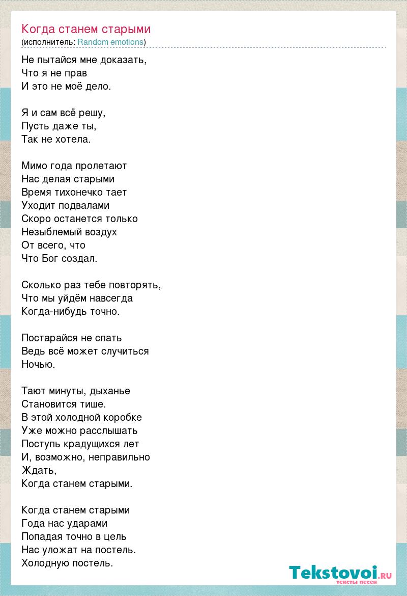 Не пытайся мне доказать, Что я не прав И это не моё дело. Я и сам всё решу, Пусть даже ты, Так не хотела. Мимо года пролетают Нас делая старыми Время тихонечко тает Уходит подвалами Скоро останется только Незыблемый воздух От всего, что Что Бог создал. Сколько раз тебе повторять, Что мы уйдём навсегда Когда-нибудь точно. Постарайся не спать Ведь всё может случиться Ночью. Тают минуты, дыханье Становится тише. В этой холодной коробке Уже можно расслышать Поступь крадущихся лет И, возможно, неправильно Ждать, Когда станем старыми. Когда станем старыми Года нас ударами Попадая точно в цель Нас уложат на постель. Холодную постель.