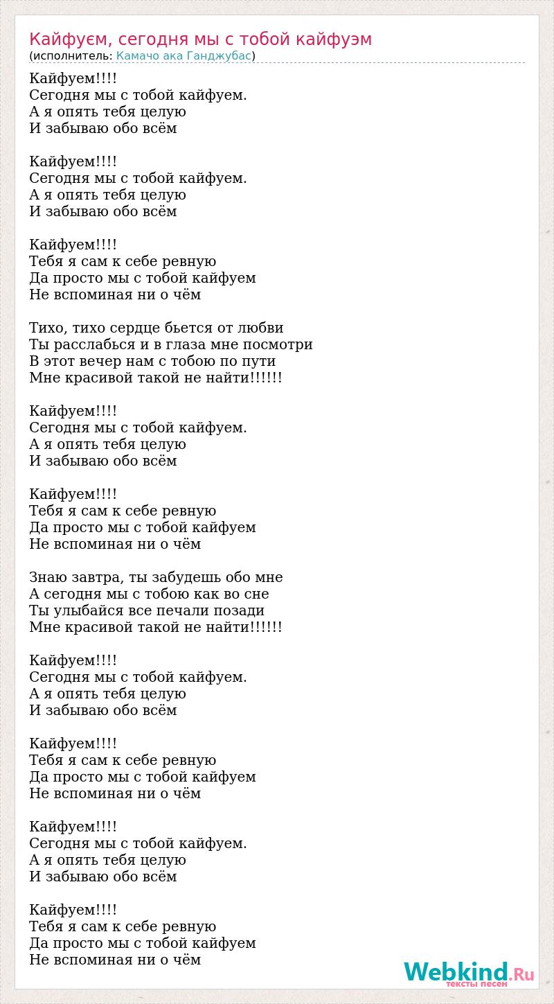 Кайфуем!!!! Сегодня мы с тобой кайфуем. А я опять тебя целую И забываю обо всём Кайфуем!!!! Сегодня мы с тобой кайфуем. А я опять тебя целую И забываю обо всём Кайфуем!!!! Тебя я сам к себе ревную Да просто мы с тобой кайфуем Не вспоминая ни о чём Тихо, тихо сердце бьется от любви Ты расслабься и в глаза мне посмотри В этот вечер нам с тобою по пути Мне красивой такой не найти!!!!!! Кайфуем!!!! Сегодня мы с тобой кайфуем. А я опять тебя целую И забываю обо всём Кайфуем!!!! Тебя я сам к себе ревную Да просто мы с тобой кайфуем Не вспоминая ни о чём Знаю завтра, ты забудешь обо мне А сегодня мы с тобою как во сне Ты улыбайся все печали позади Мне красивой такой не найти!!!!!! Кайфуем!!!! Сегодня мы с тобой кайфуем. А я опять тебя целую И забываю обо всём Кайфуем!!!! Тебя я сам к себе ревную Да просто мы с тобой кайфуем Не вспоминая ни о чём Кайфуем!!!! Сегодня мы с тобой кайфуем. А я опять тебя целую И забываю обо всём Кайфуем!!!! Тебя я сам к себе ревную Да просто мы с тобой кайфуем Не вспоминая ни о чём