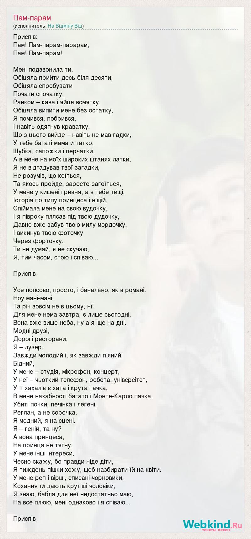 Приспів: Пам! Пам-парам-парарам, Пам! Пам-парам! Мені подзвонила ти, Обіцяла прийти десь біля десяти, Обіцяла спробувати Почати спочатку, Ранком – кава і яйця всмятку, Обіцяла випити мене без остатку, Я помився, побрився, І навіть одягнув краватку, Що з цього вийде – навіть не мав гадки, У тебе багаті мама й татко, Шубка, сапожки і перчатки, А в мене на моїх широких штанях латки, Я не відгадував твої загадки, Не розумів, що коїться, Та якось пройде, заросте-загоїться, У мене у кишені гривня, а в тебе тищі, Історія по типу принцеса і ніщій, Спіймала мене на свою вудочку, І я півроку плясав під твою дудочку, Давно вже забув твою милу мордочку, І викинув твою фоточку Через форточку. Ти не думай, я не скучаю, Я, тим часом, стою і співаю... Приспів Усе попсово, просто, і банально, як в романі. Ноу мані-мані, Та річ зовсім не в цьому, ні! Для мене нема завтра, є лише сьогодні, Вона вже вище неба, ну а я іще на дні. Модні друзі, Дорогі ресторани, Я – лузер, Завжди молодий і, як завжди п’яний, Бідний, У мене – студія, мікрофон, концерт, У неї – чьоткий тєлєфон, робота, унівєрсітєт, У її хахалів є хата і крута тачка, В мене нахабності багато і Монте-Карло пачка, Убиті почки, печінка і легені, Реглан, а не сорочка, Я модний, я на сцені. Я – геній, та ну? А вона принцеса, На принца не тягну, У мене інші інтереси, Чесно скажу, бо правди ніде діти, Я тиждень пішки хожу, щоб назбирати їй на квіти. У мене реп і вірші, списані чорновики, Кохання їй дають крутіші чоловіки, Я знаю, бабла для неї недостатньо маю, На все плюю, мені однаково і я співаю... Приспів