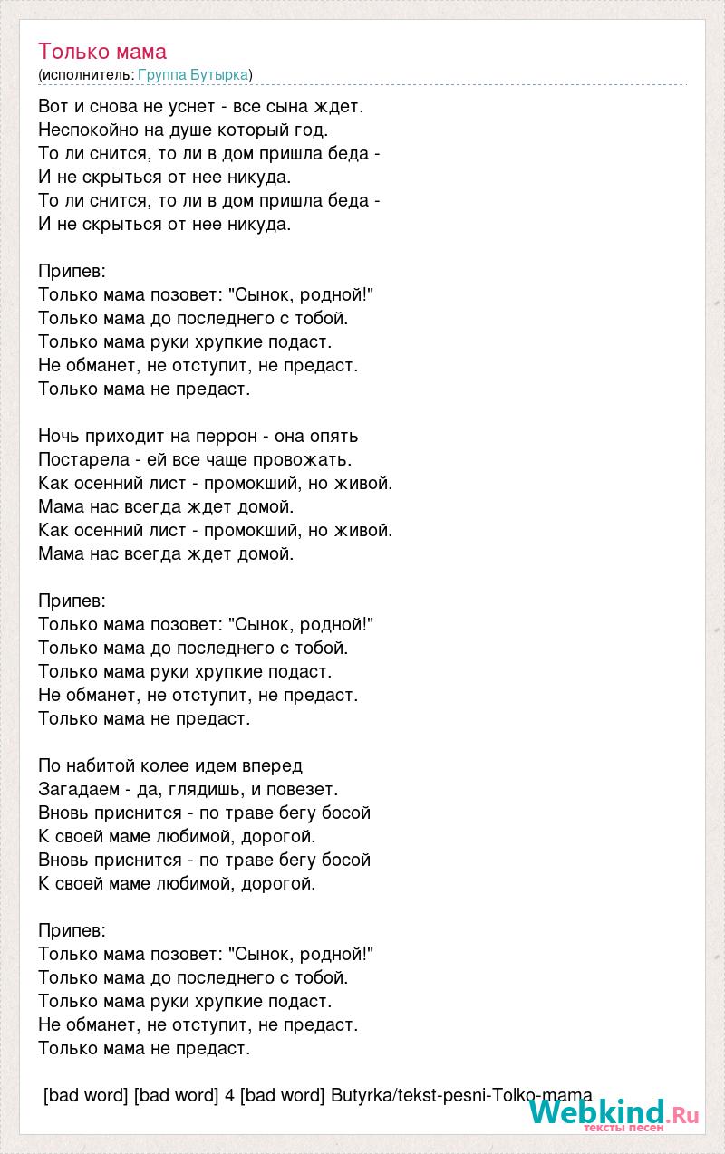 Вот и снова не уснет - все сына ждет. Неспокойно на душе который год. То ли снится, то ли в дом пришла беда - И не скрыться от нее никуда. То ли снится, то ли в дом пришла беда - И не скрыться от нее никуда. Припев: Только мама позовет: "Сынок, родной!" Только мама до последнего с тобой. Только мама руки хрупкие подаст. Не обманет, не отступит, не предаст. Только мама не предаст. Ночь приходит на перрон - она опять Постарела - ей все чаще провожать. Как осенний лист - промокший, но живой. Мама нас всегда ждет домой. Как осенний лист - промокший, но живой. Мама нас всегда ждет домой. Припев: Только мама позовет: "Сынок, родной!" Только мама до последнего с тобой. Только мама руки хрупкие подаст. Не обманет, не отступит, не предаст. Только мама не предаст. По набитой колее идем вперед Загадаем - да, глядишь, и повезет. Вновь приснится - по траве бегу босой К своей маме любимой, дорогой. Вновь приснится - по траве бегу босой К своей маме любимой, дорогой. Припев: Только мама позовет: "Сынок, родной!" Только мама до последнего с тобой. Только мама руки хрупкие подаст. Не обманет, не отступит, не предаст. Только мама не предаст. [bad word] [bad word] 4 [bad word] Butyrka/tekst-pesni-Tolko-mama
