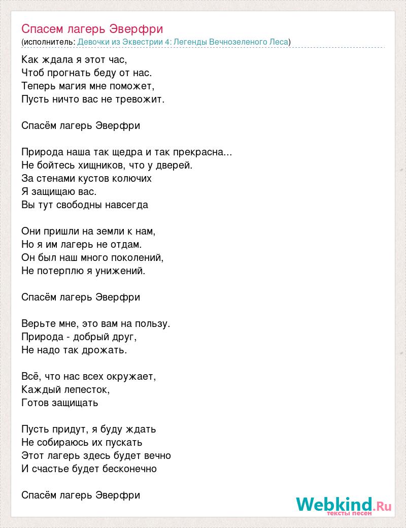 Как ждала я этот час, Чтоб прогнать беду от нас. Теперь магия мне поможет, Пусть ничто вас не тревожит. Спасём лагерь Эверфри Природа наша так щедра и так прекрасна... Не бойтесь хищников, что у дверей. За стенами кустов колючих Я защищаю вас. Вы тут свободны навсегда Они пришли на земли к нам, Но я им лагерь не отдам. Он был наш много поколений, Не потерплю я унижений. Спасём лагерь Эверфри Верьте мне, это вам на пользу. Природа - добрый друг, Не надо так дрожать. Всё, что нас всех окружает, Каждый лепесток, Готов защищать Пусть придут, я буду ждать Не собираюсь их пускать Этот лагерь здесь будет вечно И счастье будет бесконечно Спасём лагерь Эверфри