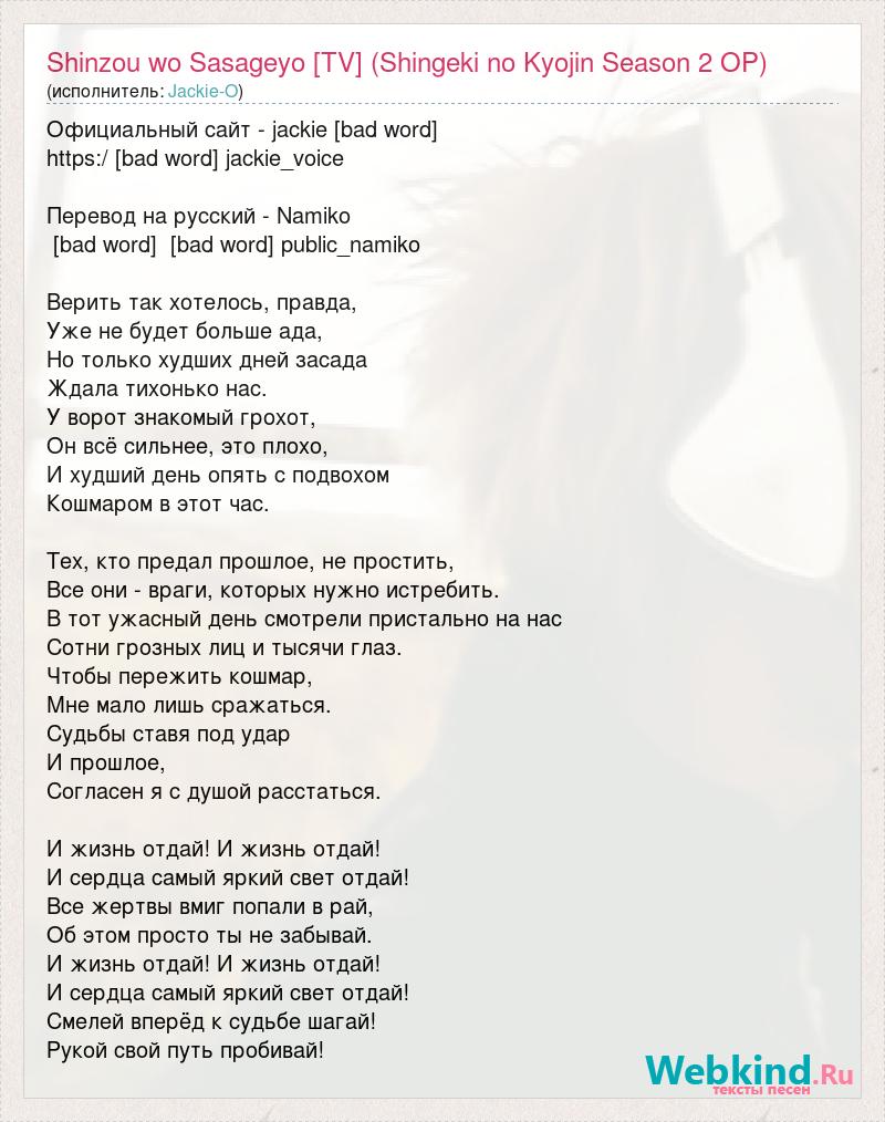 Официальный сайт - jackie [bad word] https:/ [bad word] jackie_voice Перевод на русский - Namiko [bad word] [bad word] public_namiko Верить так хотелось, правда, Уже не будет больше ада, Но только худших дней засада Ждала тихонько нас. У ворот знакомый грохот, Он всё сильнее, это плохо, И худший день опять с подвохом Кошмаром в этот час. Тех, кто предал прошлое, не простить, Все они - враги, которых нужно истребить. В тот ужасный день смотрели пристально на нас Сотни грозных лиц и тысячи глаз. Чтобы пережить кошмар, Мне мало лишь сражаться. Судьбы ставя под удар И прошлое, Согласен я с душой расстаться. И жизнь отдай! И жизнь отдай! И сердца самый яркий свет отдай! Все жертвы вмиг попали в рай, Об этом просто ты не забывай. И жизнь отдай! И жизнь отдай! И сердца самый яркий свет отдай! Смелей вперёд к судьбе шагай! Рукой свой путь пробивай!