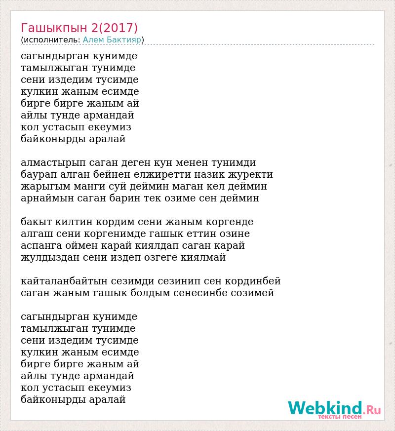 сагындырган кунимде тамылжыган тунимде сени издедим тусимде кулкин жаным есимде бирге бирге жаным ай айлы тунде армандай кол устасып екеумиз байконырды аралай алмастырып саган деген кун менен тунимди баурап алган бейнен елжиретти назик журекти жарыгым манги суй деймин маган кел деймин арнаймын саган барин тек озиме сен деймин бакыт килтин кордим сени жаным коргенде алгаш сени коргенимде гашык еттин озине аспанга оймен карай киялдап саган карай жулдыздан сени издеп озгеге киялмай кайталанбайтын сезимди сезинип сен кординбей саган жаным гашык болдым сенесинбе созимей сагындырган кунимде тамылжыган тунимде сени издедим тусимде кулкин жаным есимде бирге бирге жаным ай айлы тунде армандай кол устасып екеумиз байконырды аралай