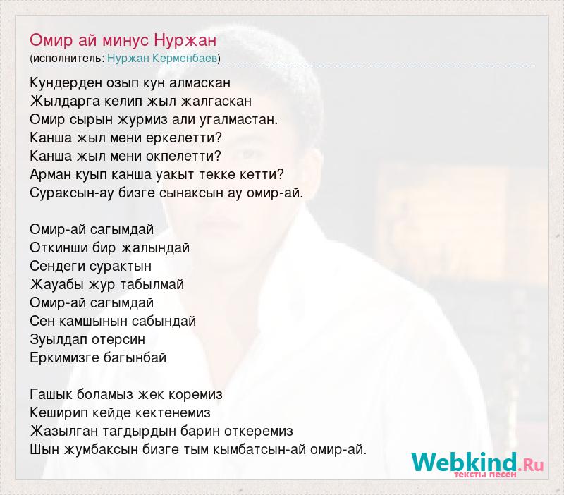 Кундерден озып кун алмаскан Жылдарга келип жыл жалгаскан Омир сырын журмиз али угалмастан. Канша жыл мени еркелетти? Канша жыл мени окпелетти? Арман куып канша уакыт текке кетти? Сураксын-ау бизге сынаксын ау омир-ай. Омир-ай сагымдай Откинши бир жалындай Сендеги сурактын Жауабы жур табылмай Омир-ай сагымдай Сен камшынын сабындай Зуылдап отерсин Еркимизге багынбай Гашык боламыз жек коремиз Кеширип кейде кектенемиз Жазылган тагдырдын барин откеремиз Шын жумбаксын бизге тым кымбатсын-ай омир-ай.