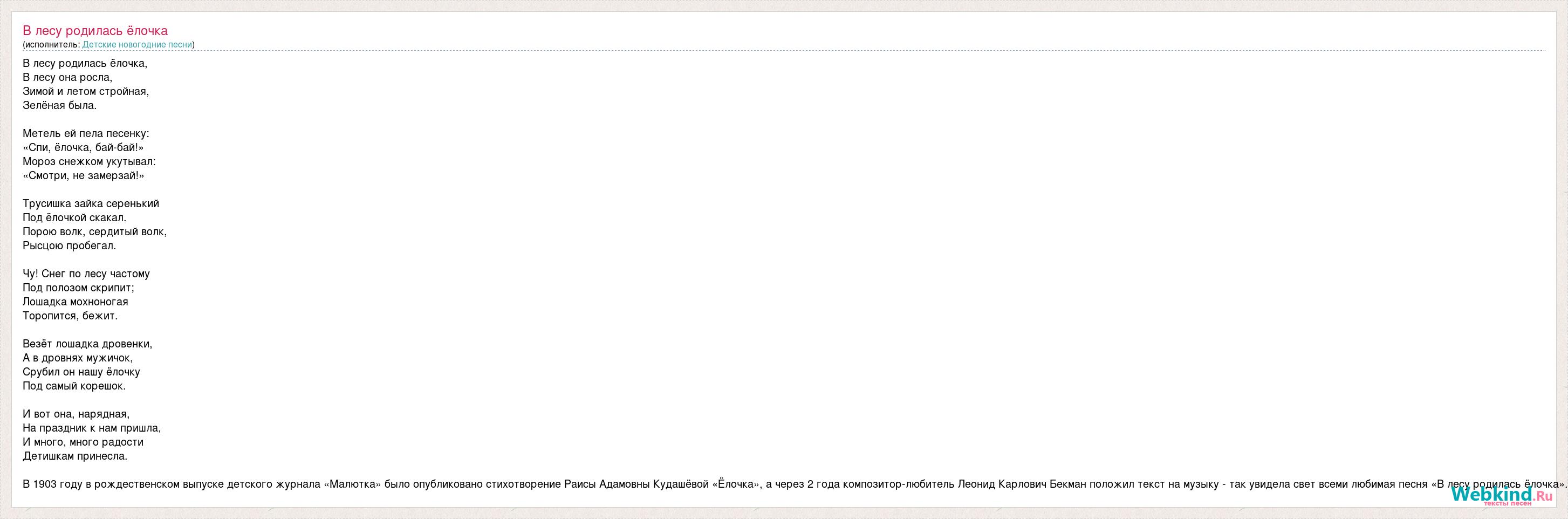 В лесу родилась ёлочка, В лесу она росла, Зимой и летом стройная, Зелёная была. Метель ей пела песенку: «Спи, ёлочка, бай-бай!» Мороз снежком укутывал: «Смотри, не замерзай!» Трусишка зайка серенький Под ёлочкой скакал. Порою волк, сердитый волк, Рысцою пробегал. Чу! Снег по лесу частому Под полозом скрипит; Лошадка мохноногая Торопится, бежит. Везёт лошадка дровенки, А в дровнях мужичок, Срубил он нашу ёлочку Под самый корешок. И вот она, нарядная, На праздник к нам пришла, И много, много радости Детишкам принесла. В 1903 году в рождественском выпуске детского журнала «Малютка» было опубликовано стихотворение Раисы Адамовны Кудашёвой «Ёлочка», а через 2 года композитор-любитель Леонид Карлович Бекман положил текст на музыку - так увидела свет всеми любимая песня «В лесу родилась ёлочка».
