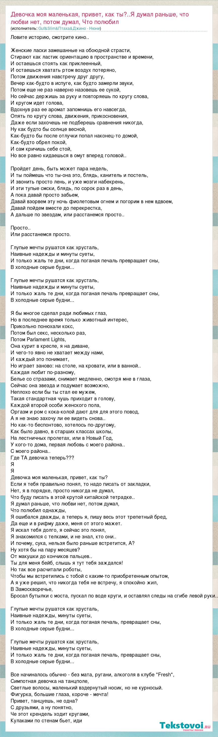 Главная→Исполнители→Guf&Slim&Птаха&Джино - Нюни→Девочка моя маленькая, привет, как ты?..Я думал раньше, что любви нет, п