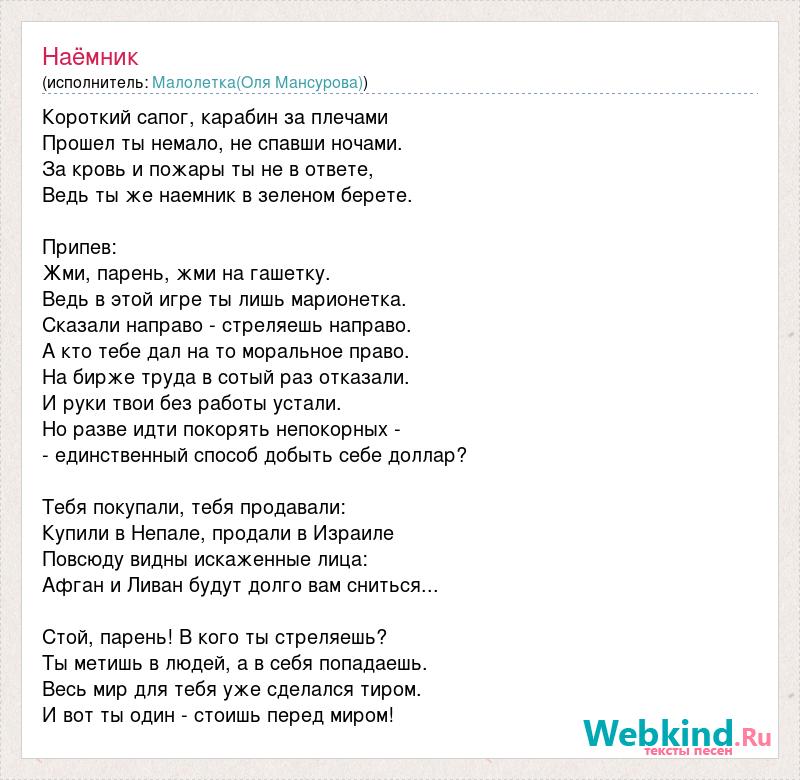 Короткий сапог, карабин за плечами Прошел ты немало, не спавши ночами. За кровь и пожары ты не в ответе, Ведь ты же наемник в зеленом берете. Припев: Жми, парень, жми на гашетку. Ведь в этой игре ты лишь марионетка. Сказали направо - стреляешь направо. А кто тебе дал на то моральное право. На бирже труда в сотый раз отказали. И руки твои без работы устали. Но разве идти покорять непокорных - - единственный способ добыть себе доллар? Тебя покупали, тебя продавали: Купили в Непале, продали в Израиле Повсюду видны искаженные лица: Афган и Ливан будут долго вам сниться... Стой, парень! В кого ты стреляешь? Ты метишь в людей, а в себя попадаешь. Весь мир для тебя уже сделался тиром. И вот ты один - стоишь перед миром!