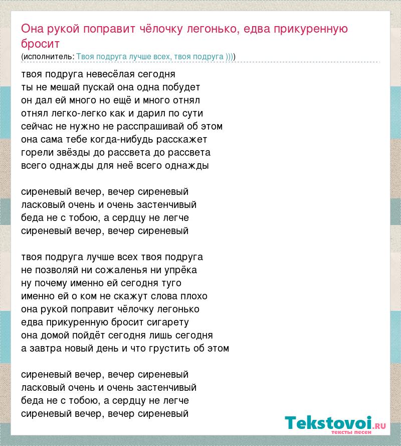 твоя подруга невесёлая сегодня ты не мешай пускай она одна побудет он дал ей много но ещё и много отнял отнял легко-легко как и дарил по сути сейчас не нужно не расспрашивай об этом она сама тебе когда-нибудь расскажет горели звёзды до рассвета до рассвета всего однажды для неё всего однажды сиреневый вечер, вечер сиреневый ласковый очень и очень застенчивый беда не с тобою, а сердцу не легче сиреневый вечер, вечер сиреневый твоя подруга лучше всех твоя подруга не позволяй ни сожаленья ни упрёка ну почему именно ей сегодня туго именно ей о ком не скажут слова плохо она рукой поправит чёлочку легонько едва прикуренную бросит сигарету она домой пойдёт сегодня лишь сегодня а завтра новый день и что грустить об этом сиреневый вечер, вечер сиреневый ласковый очень и очень застенчивый беда не с тобою, а сердцу не легче сиреневый вечер, вечер сиреневый