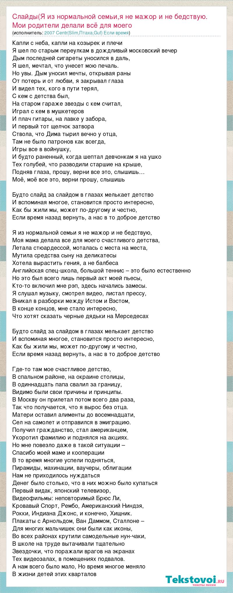 Главная→Исполнители→2007 Centr(Slim,Птаха,Guf) Если время→Слайды(Я из нормальной семьи,я не мажор и не бедствую. Мои родители дел