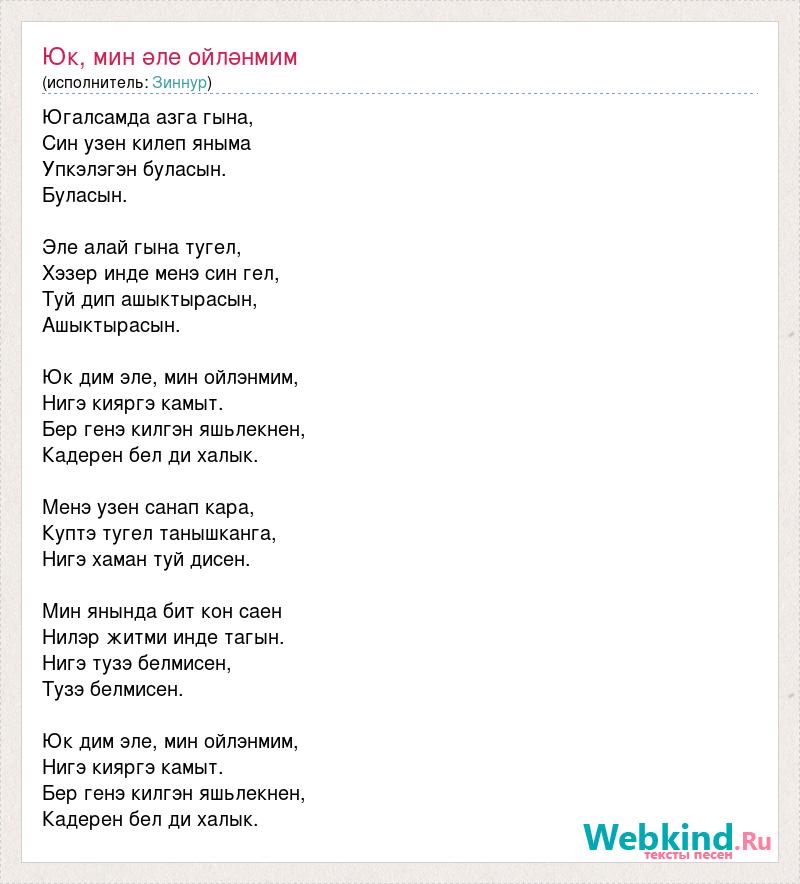 Югалсамда азга гына, Син узен килеп яныма Упкэлэгэн буласын. Буласын. Эле алай гына тугел, Хэзер инде менэ син гел, Туй дип ашыктырасын, Ашыктырасын. Юк дим эле, мин ойлэнмим, Нигэ кияргэ камыт. Бер генэ килгэн яшьлекнен, Кадерен бел ди халык. Менэ узен санап кара, Куптэ тугел танышканга, Нигэ хаман туй дисен. Мин янында бит кон саен Нилэр житми инде тагын. Нигэ тузэ белмисен, Тузэ белмисен. Юк дим эле, мин ойлэнмим, Нигэ кияргэ камыт. Бер генэ килгэн яшьлекнен, Кадерен бел ди халык.