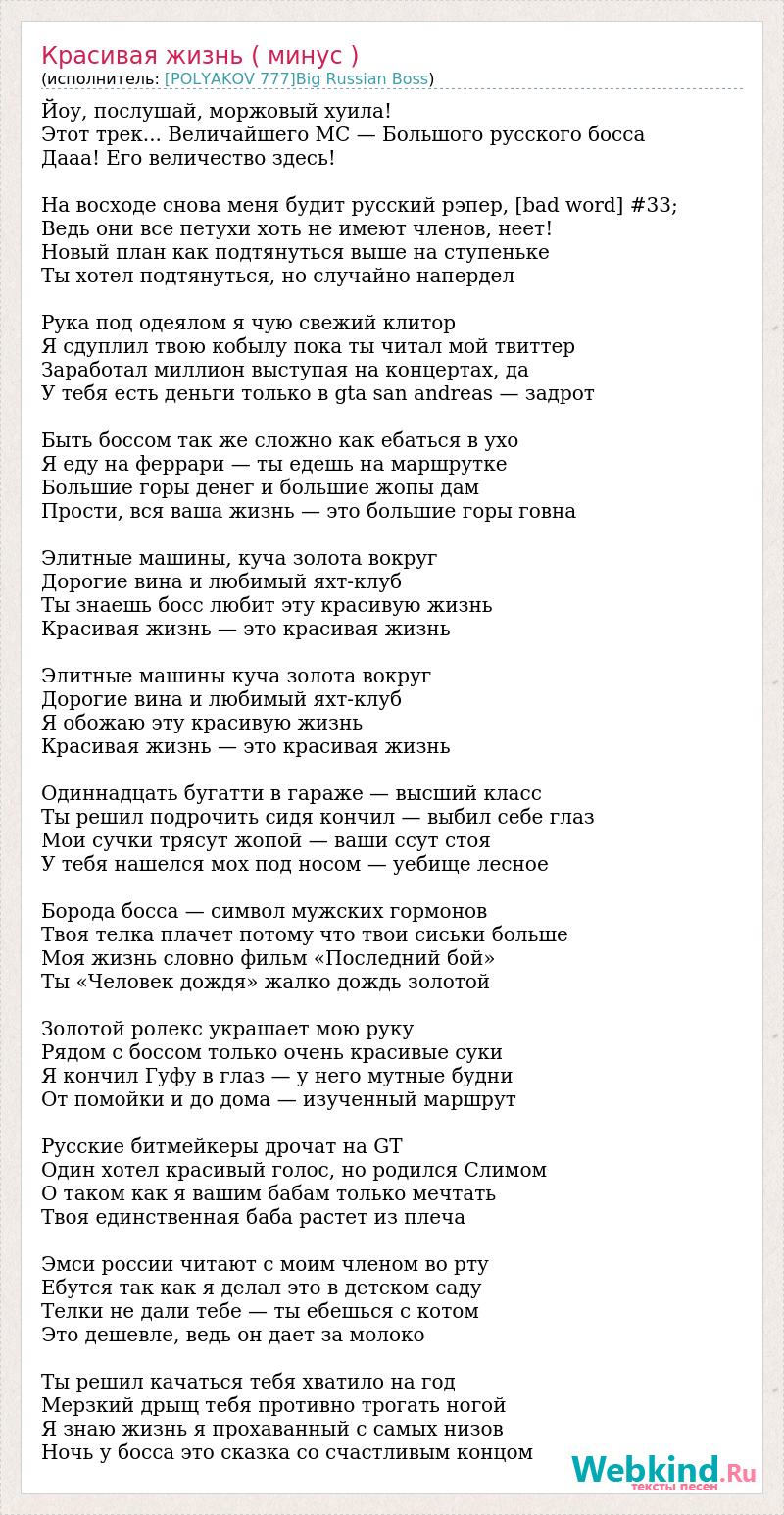 Йоу, послушай, моржовый хуила! Этот трек... Величайшего МС — Большого русского босса Дааа! Его величество здесь! На восходе снова меня будит русский рэпер, [bad word] #33; Ведь они все петухи хоть не имеют членов, неет! Новый план как подтянуться выше на ступеньке Ты хотел подтянуться, но случайно напердел Рука под одеялом я чую свежий клитор Я сдуплил твою кобылу пока ты читал мой твиттер Заработал миллион выступая на концертах, да У тебя есть деньги только в gta san andreas — задрот Быть боссом так же сложно как ебаться в ухо Я еду на феррари — ты едешь на маршрутке Большие горы денег и большие жопы дам Прости, вся ваша жизнь — это большие горы говна Элитные машины, куча золота вокруг Дорогие вина и любимый яхт-клуб Ты знаешь босс любит эту красивую жизнь Красивая жизнь — это красивая жизнь Элитные машины куча золота вокруг Дорогие вина и любимый яхт-клуб Я обожаю эту красивую жизнь Красивая жизнь — это красивая жизнь Одиннадцать бугатти в гараже — высший класс Ты решил подрочить сидя кончил — выбил себе глаз Мои сучки трясут жопой — ваши ссут стоя У тебя нашелся мох под носом — уебище лесное Борода босса — символ мужских гормонов Твоя телка плачет потому что твои сиськи больше Моя жизнь словно фильм «Последний бой» Ты «Человек дождя» жалко дождь золотой Золотой ролекс украшает мою руку Рядом с боссом только очень красивые суки Я кончил Гуфу в глаз — у него мутные будни От помойки и до дома — изученный маршрут Русские битмейкеры дрочат на GT Один хотел красивый голос, но родился Слимом О таком как я вашим бабам только мечтать Твоя единственная баба растет из плеча Эмси россии читают с моим членом во рту Ебутся так как я делал это в детском саду Телки не дали тебе — ты ебешься с котом Это дешевле, ведь он дает за молоко Ты решил качаться тебя хватило на год Мерзкий дрыщ тебя противно трогать ногой Я знаю жизнь я прохаванный с самых низов Ночь у босса это сказка со счастливым концом