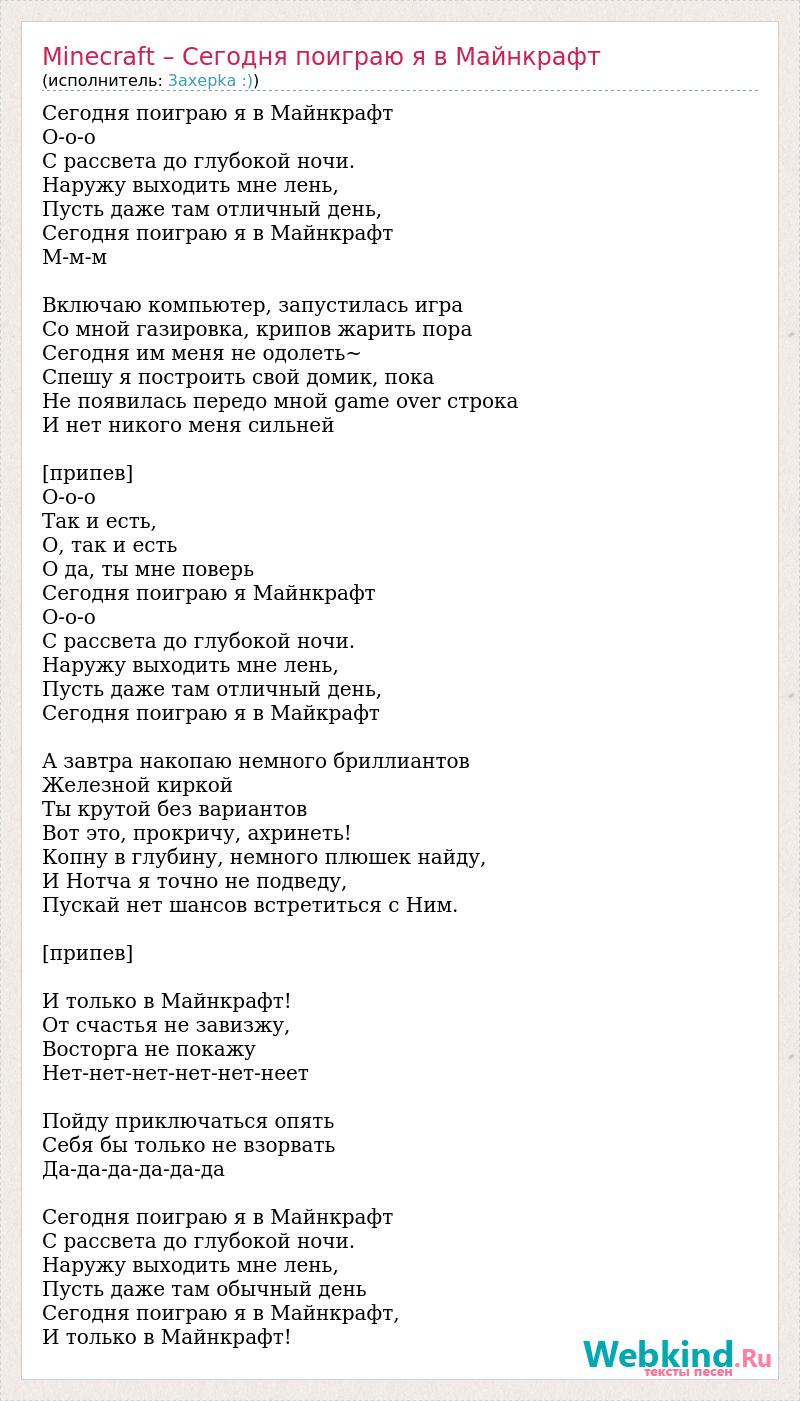 Сегодня поиграю я в Майнкрафт О-о-о С рассвета до глубокой ночи. Наружу выходить мне лень, Пусть даже там отличный день, Сегодня поиграю я в Майнкрафт М-м-м Включаю компьютер, запустилась игра Со мной газировка, крипов жарить пора Сегодня им меня не одолеть~ Спешу я построить свой домик, пока Не появилась передо мной game over строка И нет никого меня сильней [припев] О-о-о Так и есть, О, так и есть О да, ты мне поверь Сегодня поиграю я Майнкрафт О-о-о С рассвета до глубокой ночи. Наружу выходить мне лень, Пусть даже там отличный день, Сегодня поиграю я в Майкрафт А завтра накопаю немного бриллиантов Железной киркой Ты крутой без вариантов Вот это, прокричу, ахринеть! Копну в глубину, немного плюшек найду, И Нотча я точно не подведу, Пускай нет шансов встретиться с Ним. [припев] И только в Майнкрафт! От счастья не завизжу, Восторга не покажу Нет-нет-нет-нет-нет-неет Пойду приключаться опять Себя бы только не взорвать Да-да-да-да-да-да Сегодня поиграю я в Майнкрафт С рассвета до глубокой ночи. Наружу выходить мне лень, Пусть даже там обычный день Сегодня поиграю я в Майнкрафт, И только в Майнкрафт!